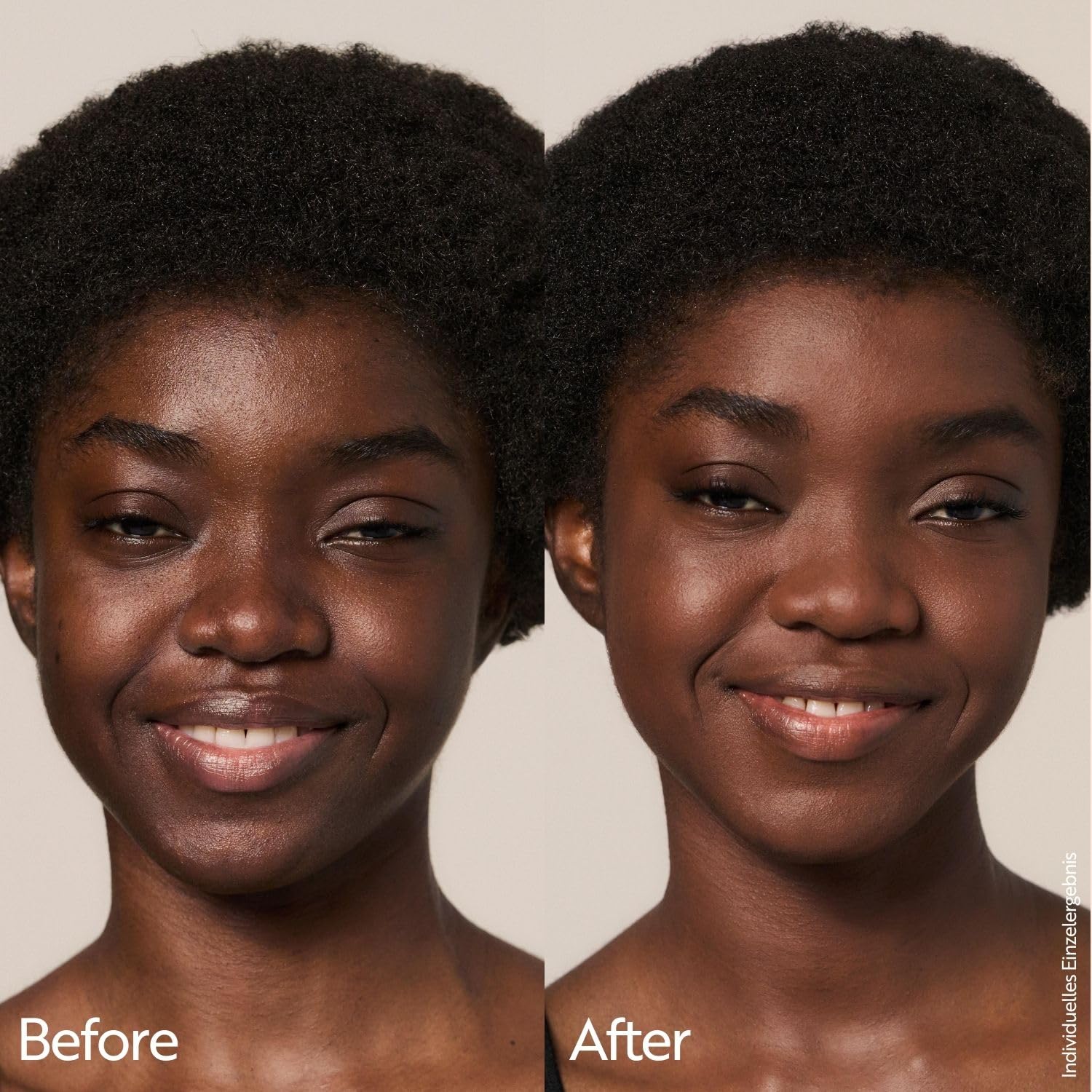 - β APPLICATION: Apply your usual face care and let it absorb. Then, apply the serum foundation with a brush, sponge, or fingers, blending the product thoroughly for a full, even base.