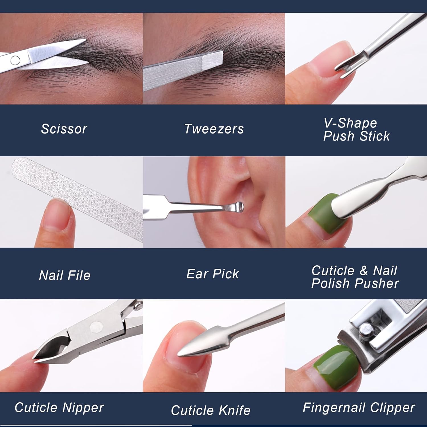 - 【Mani Pedi Kit with Luxury Fashion Case】 Our manicure kit with a blue gorgeous leather case makes it a fashionable and popular gift for your relatives, friends, parents, and the husband. Lightweight and portable travel essentials can offer exceptional foot, hand, and facial grooming tools.