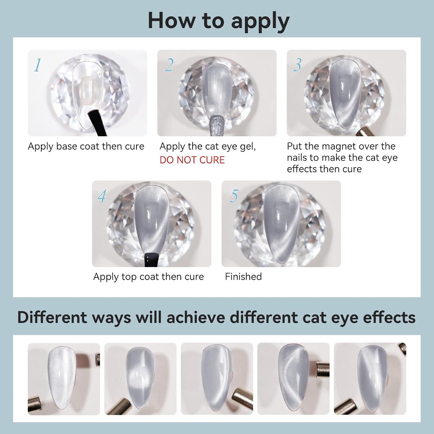 - Warm Tips From Bevimee: 1. This mooncat nail polish needs to use a magnet to get the cat eye effect; 2. This is UV gel nail polish, which requires curing under the nail lamp for 90-120 seconds