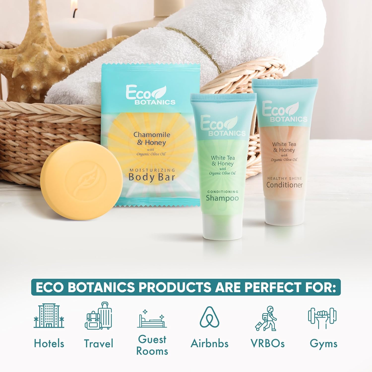 - WHY CHOOSE ECO BOTANICS? Our high-end formula & environmentally-friendly beautiful design bring elegance to any upscale property. These hotel toiletries are paraben-free, gluten-free & made with organic aloe, honey, & olive oil for soft skin & hair!