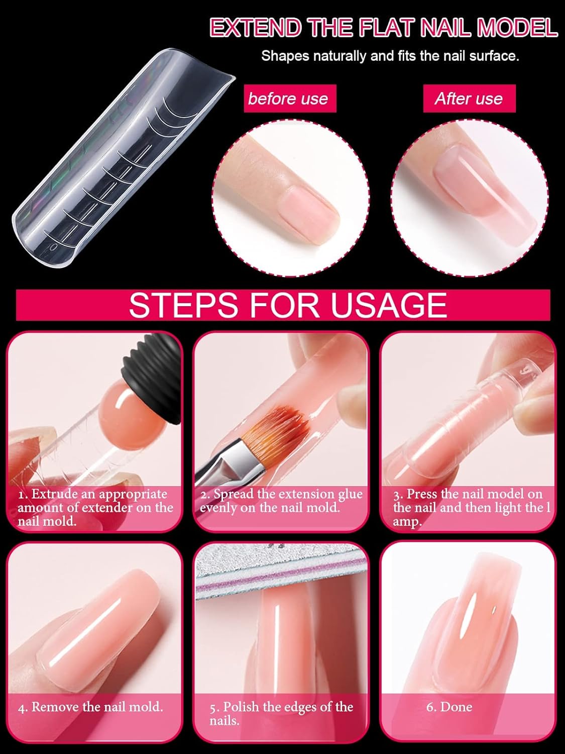 - 【Durable Gel Nail Mold】Reusable nail forms are made with high quality material, which is strong, tough, and reusable, providing you with a wonderful nail art experience that lasts.This artificial nails forms protective sleeve has a small handle on both sides, which is convenient for constructing gel nail extension nails, and will not stick to your hands, and can be easily removed after application.