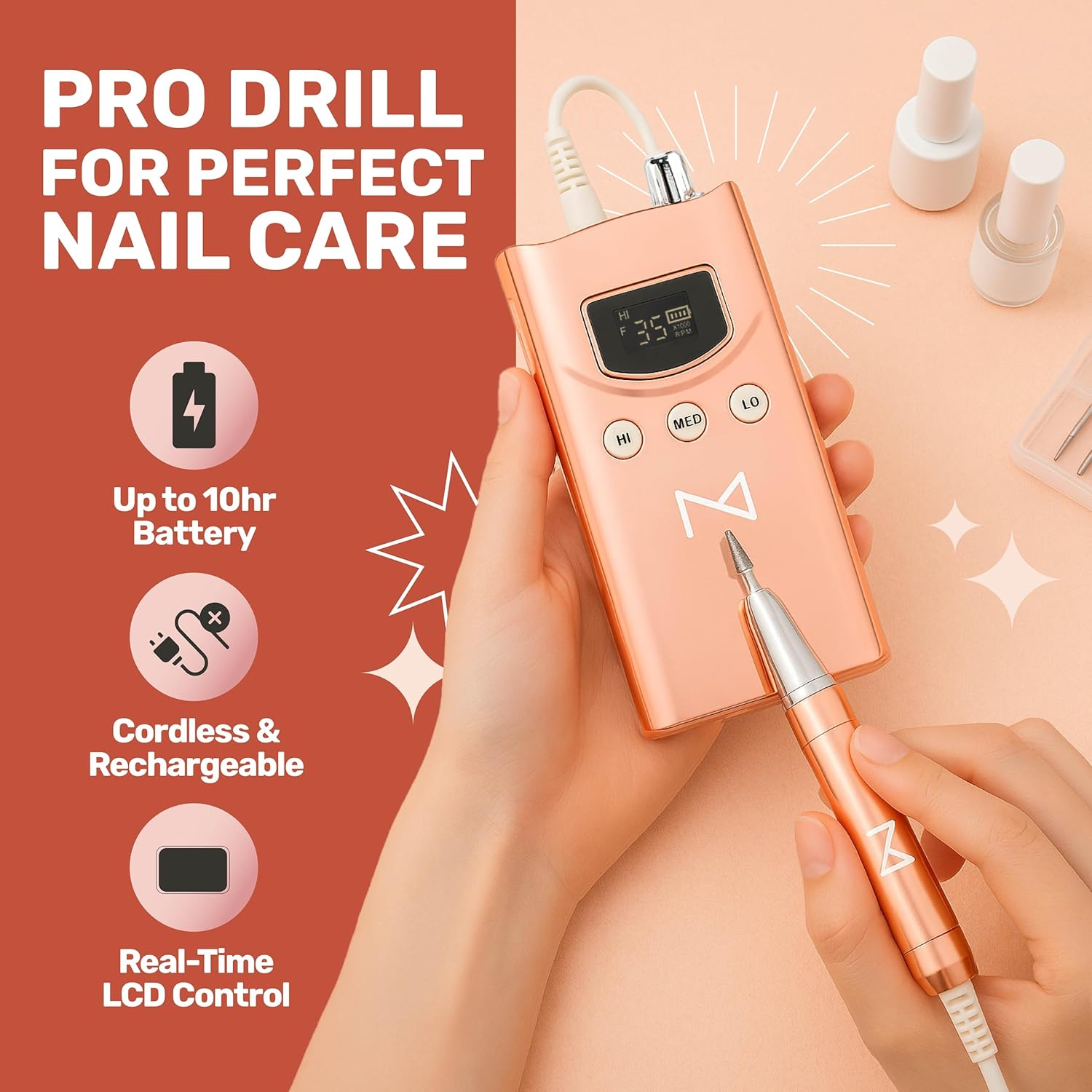 - Nonstop Performance: Our nails machine professional features a built-in rechargeable battery and brushless motor for up to 10 hours of continuous use. With a quick 2-3 hour recharge and an LCD battery status display, it's perfect for hassle-free appointments.