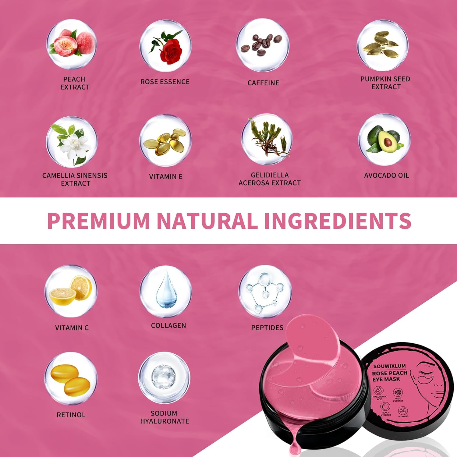 - Premium Ingredients Eye Mask Skincare: These eye patches for wrinkles feature holy grail ingredients, including rose extract, peach extract, caffeine, pumpkin seed extract, sodium hyaluronate, avocado oil, gelidiella acerosa extract, camellia sinensis leaf extract, peptides, collagen, vitamins, known for their age-defying properties. As a result, these rose under eye patches provide all-in-one nourishment and treatment, targeting under eye puffiness, dark circles, and other signs of aging.