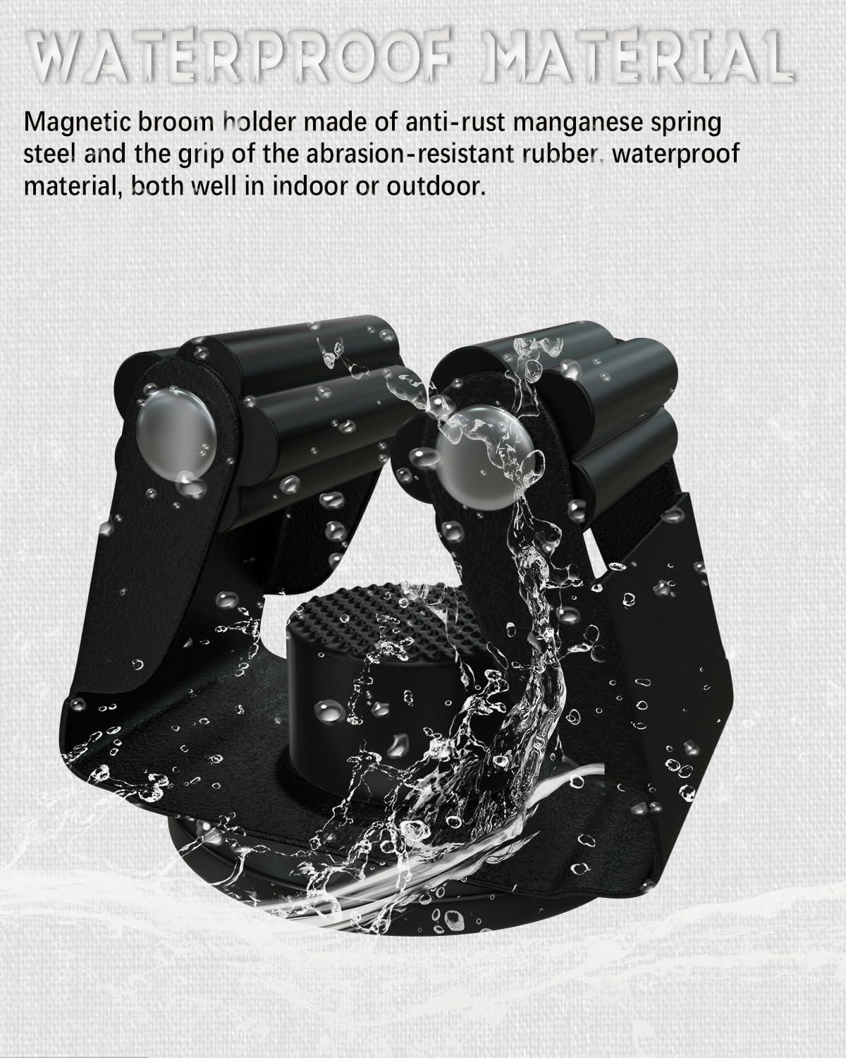 - Magnetic base: magnetic mop broom holder base are rubber coated magnets; the rubber surface protect the adsorbed object and will not allow external stains to pollute the magnet inside; so they can be applied outdoors for a long time with confidence