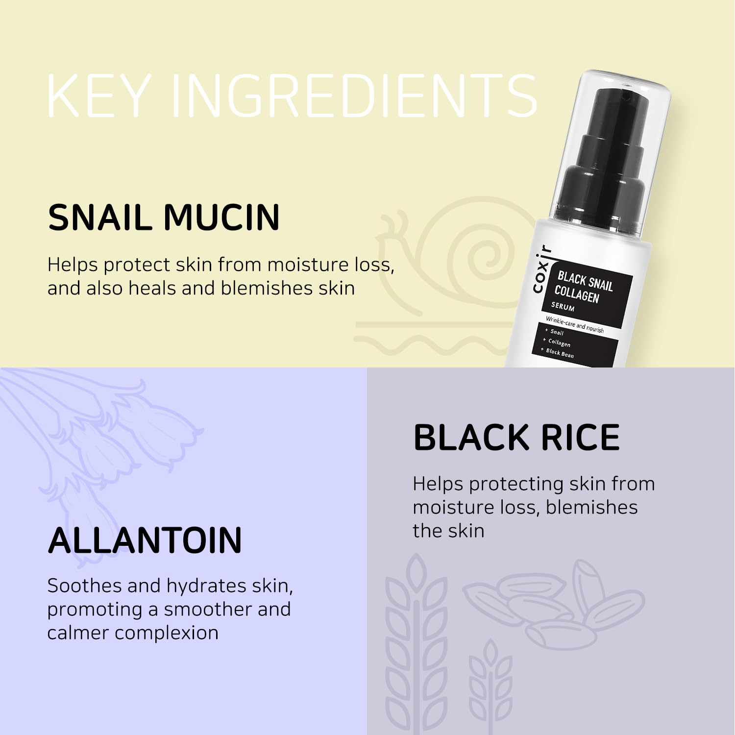 - [Intensive Snail Wrinkle Serum] Snail secretion filtrate repairs and nourishes skin from dryness, and Collagen for firming and lifting skin from dry, aged skin. This serum helps wrinkle care, fade away fine lines, blemish and care elasticity that results in plump, dewy skin