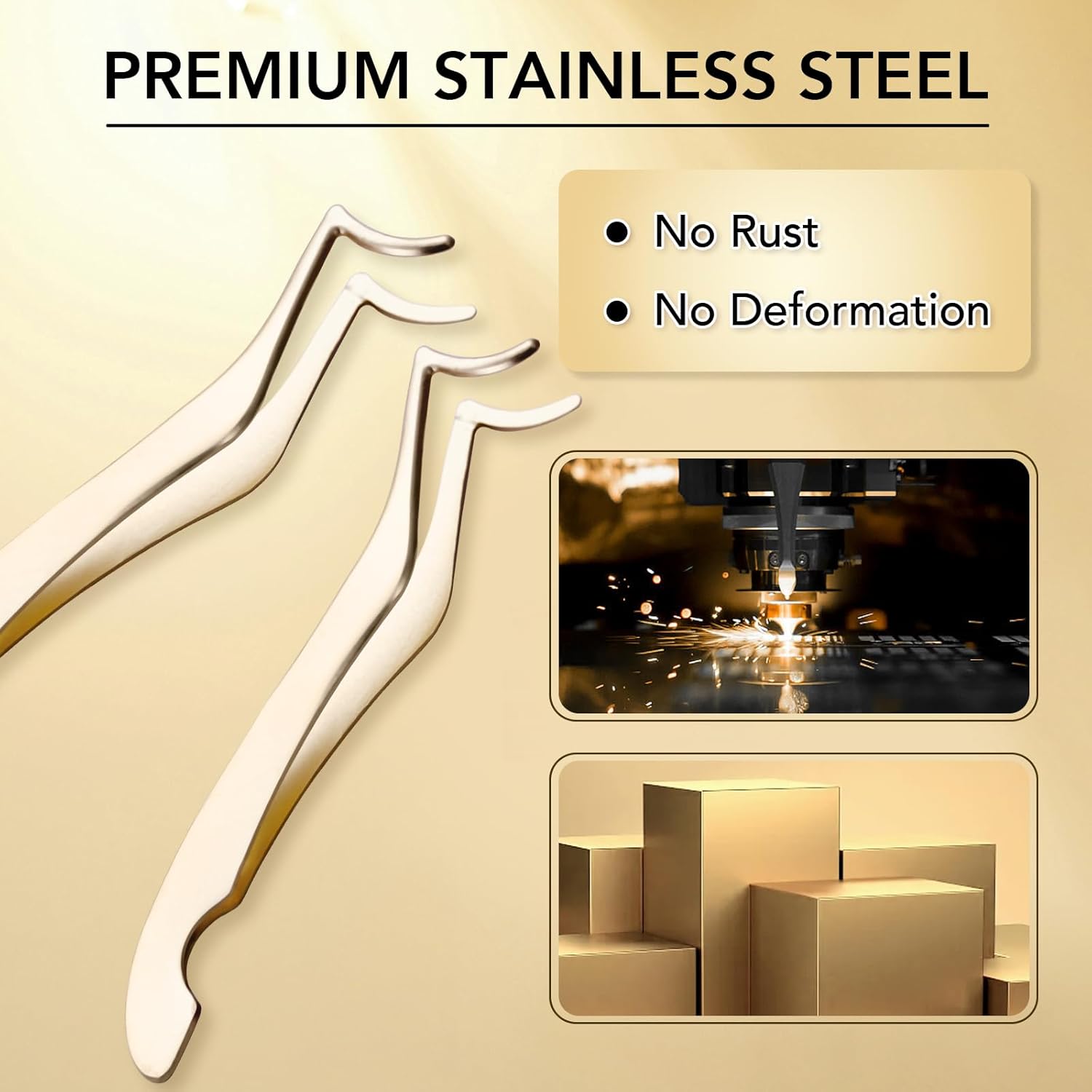 - 【 Premium Material 】 The false eyelash tweezers made of high quality stainless steel, durable and not easy to rust. The curved shape is very suitable for your eyes, and it is comfortable to use.TIPS: Please clean the eyelash cluster applicator after each use to ensure there is no glue residue on lashes clusters tweezers to keep them for long-term use