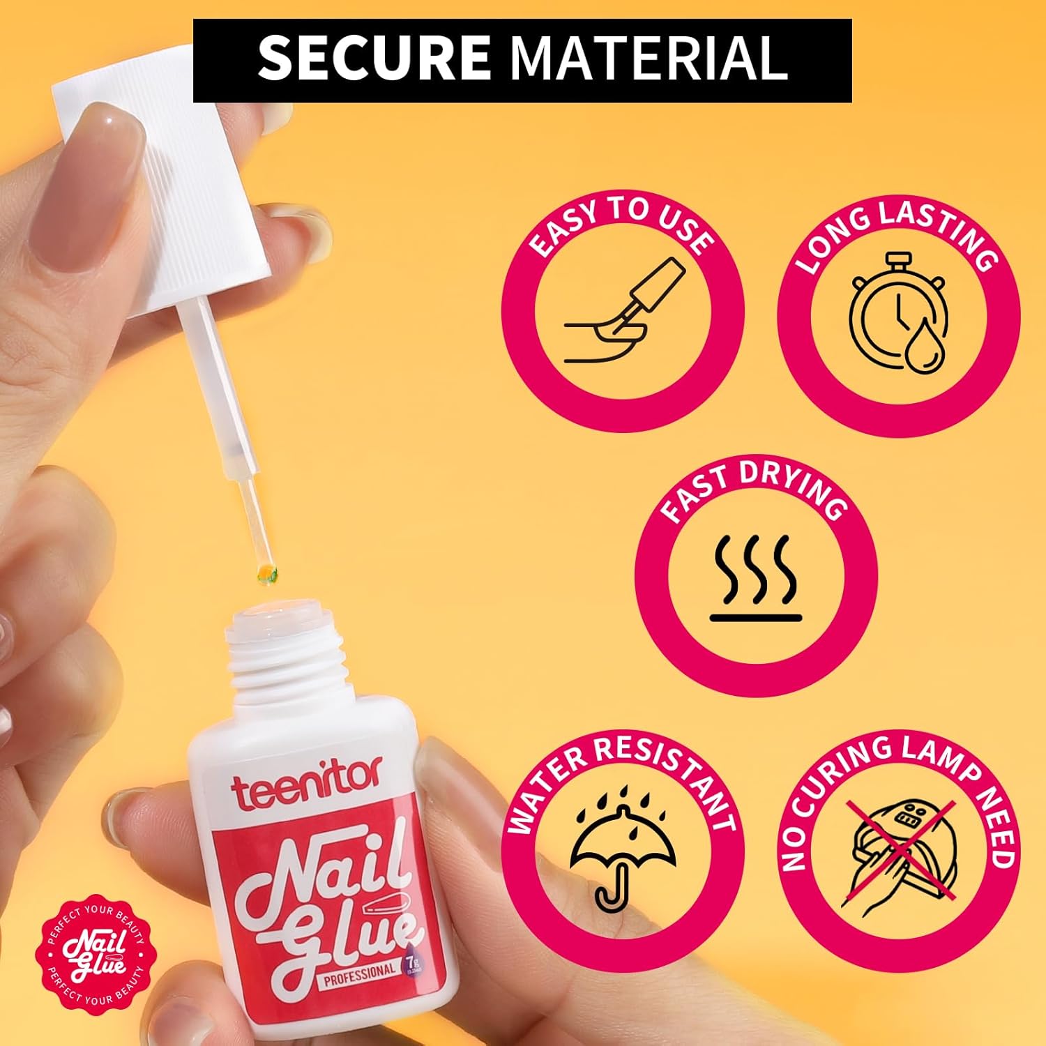 - Super Strong & Dry in 5 Second: Our Teenitor 7g strong nail glue for press on nails is made of premium quality nail pink glue which is different from others, easy to dry in 5 second, strong adhesive allow long lasting to 14-21 days-Easy to Use, Long Lasting, Fast Drying, Water Resistant and No Curing Lamp Need; seal design of bottle will not leak easily and better keep the glue