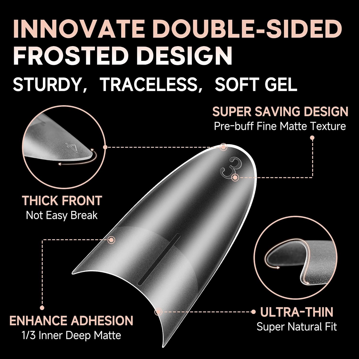 - ๐ NEWLY DOUBLE SIDE MATTE TEXTURE-Our medium almond gel nail tips feature new double-sided matte nail tips design, no extra filing required! The outer wall makes it easier to apply nail polish and gives a glossy finish. The inner deep matte firmly adheres to the nail without worrying about the nail pop off easily. Easily get beauty that lasts 28+ days. We are committed to bringing you professional, efficient and safe nail care.