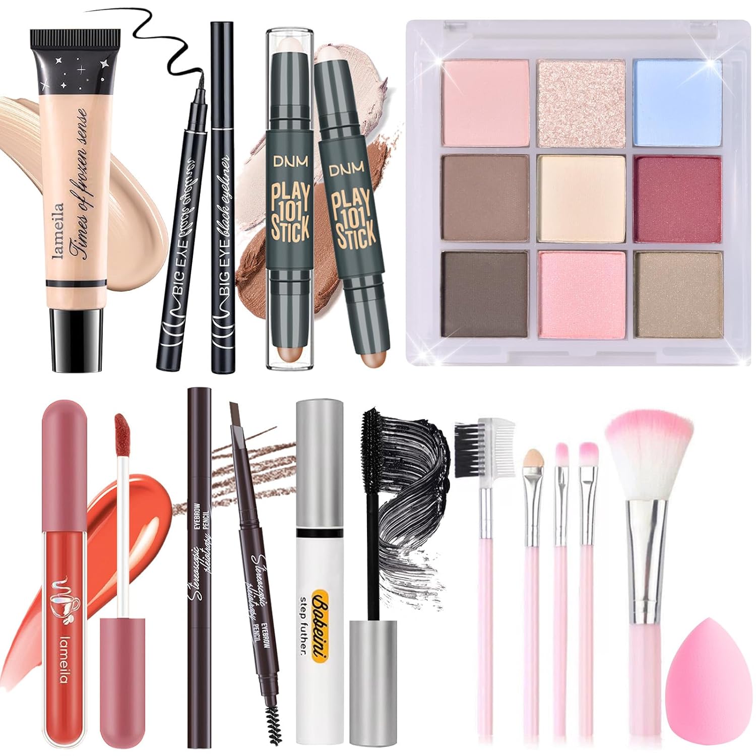 - [Makeup Set] The ideal starter makeup kit includes 9 colors eyeshadow palette, dual-ended counter and highlighter stick, full coverage liquid foundation, dual-ended eyebrow pencil, eyeliner, waterproof mascara, lip gloss, 5 PCs makeup brushes set, makeup sponge. All womenโs makeup essentials are included.