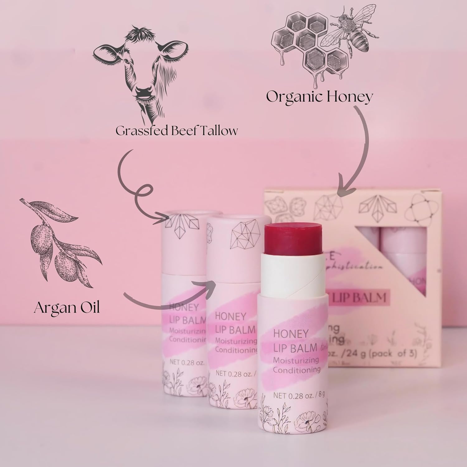 Organic Honey Lip Balm - 100% Grassfed Beef Tallow Chapstick for Women, Natural Raw Honey & Argan Oil - Ultra Moisturizing, Conditioning, Chemical Free - 3 Pack (3x0.15 oz) Tinted