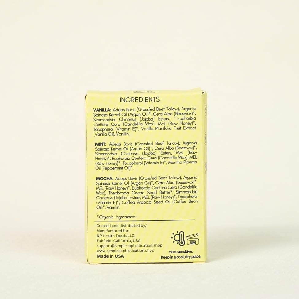 - INGREDIENTS: Grassfed grass-finished beef tallow, organic argan oil, organic raw honey, organic beeswax, organic candelilla wax, organic vitamin E, organic spearmint essential oil.