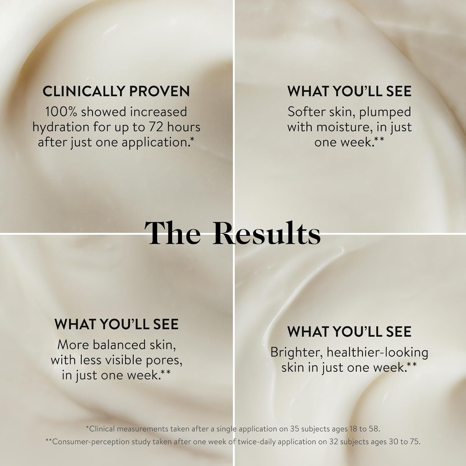 - *Clinical measurements taken after a single application on 35 subjects ages 18 to 58. **Clinical measurements taken after four weeks of twice-daily application on 32 subjects ages 30 to 75.
