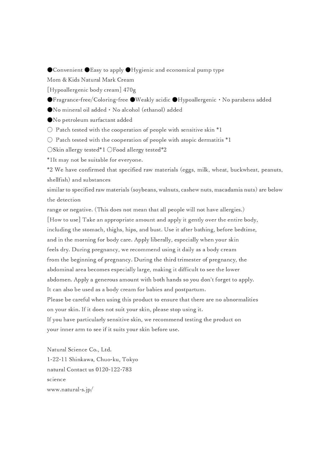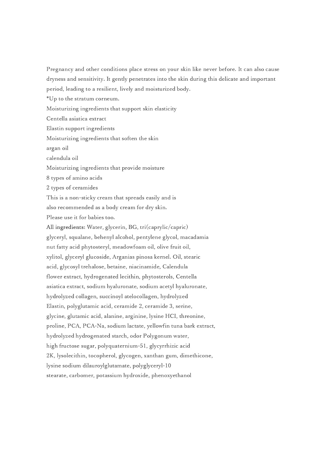 - 【Moisturizing for Dry Skin】 A body cream born from the collaboration of midwives and experienced moms. It's a fragrance-free, color-free, and gentle formula, perfect for Japanese expectant mothers. Its ease of use without the need for massage is one of its appealing features. With its high moisturizing power, it's also great as a body cream for combating dryness.