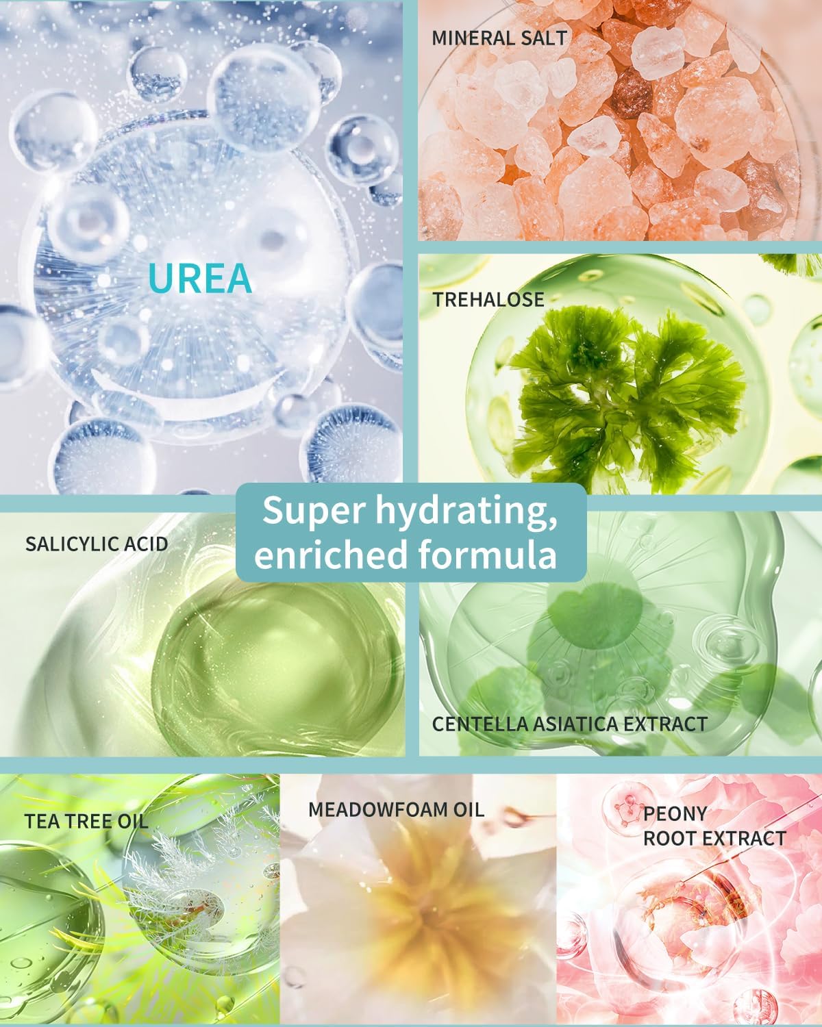 - Deep Cleansing, Soothing & Repairing: The natural mineral salt scrub with urea is used with a blend of essential oils enriched with tea tree oil to quickly soften calluses and rough skin, helping to gently exfoliate and remove dead skin while hydrating and providing essential nutrients to dry skin. After scrubbing, apply a few drops of the serum evenly to soothe and deeply moisturize cracked skin. Leaves our hands and feet feeling soft, smooth, comfortable and clean.