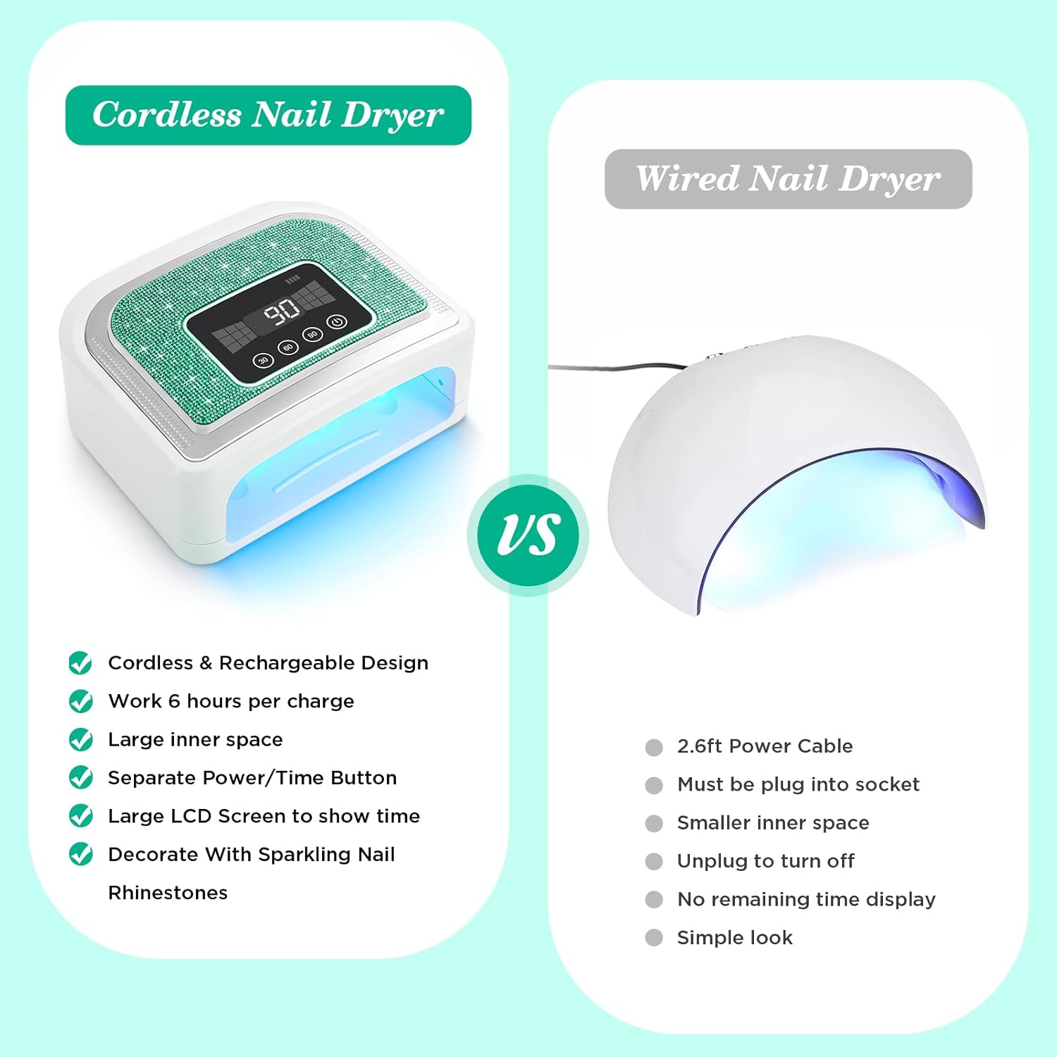 - ๐ ใ๐๐๐๐ก๐๐ซ๐ ๐๐๐๐ฅ๐ Cordless Nail LampใContinuous use of 2-5 hours after 3 hours full charge. LCD screen will prompt you to charge when needed. Portable uv nail lamp can be taken to anywhere without the power cord. (Note: Not recommended to use the nail lamp while charging)