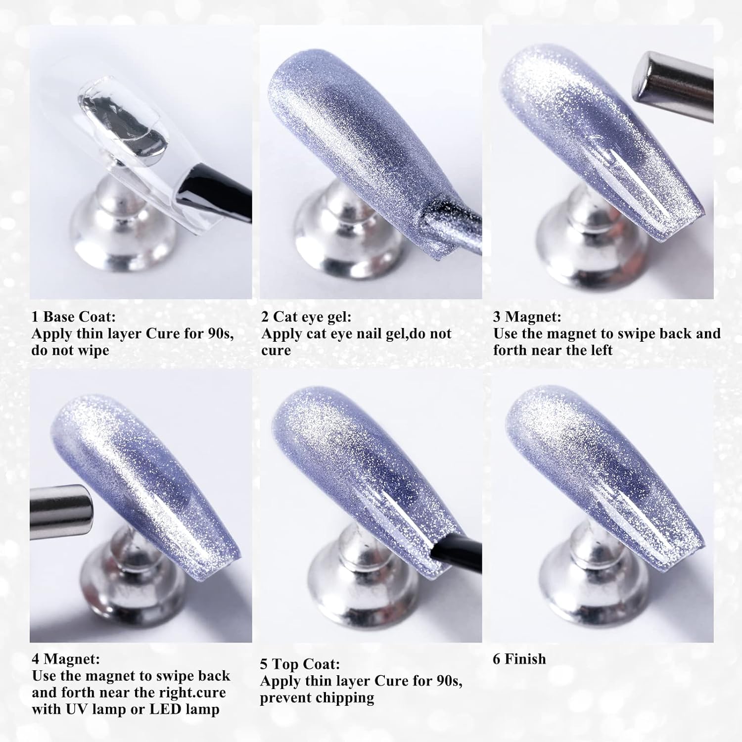 - Applying our Gel Nail Polish is a breeze, simply follow our step-by-step instructions for flawless results every time: Use the magnet to create desired pattern before curing. Apply gel top coat for gorgeous shimmery and sparkly finish. Heat up in winter to reduce thickness.