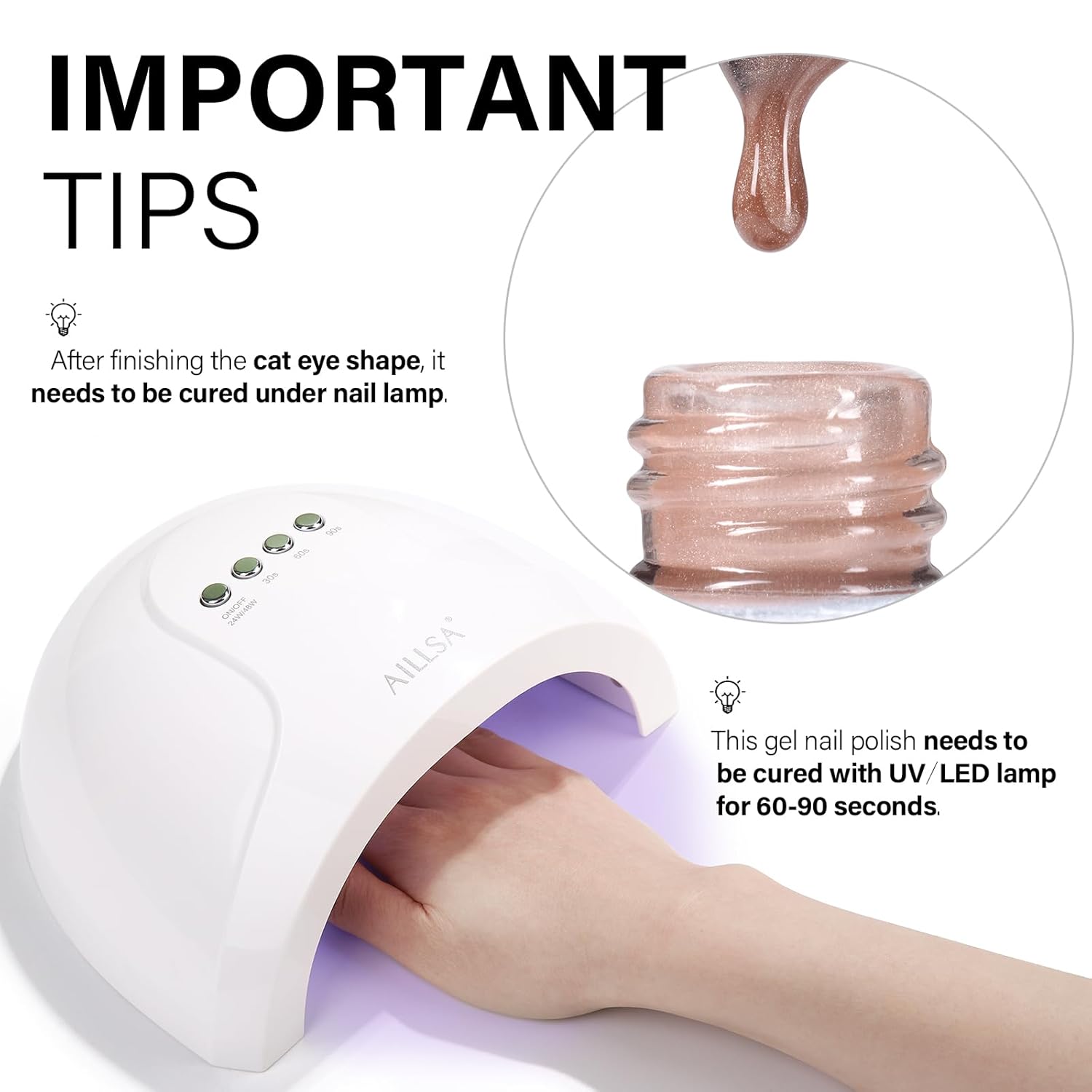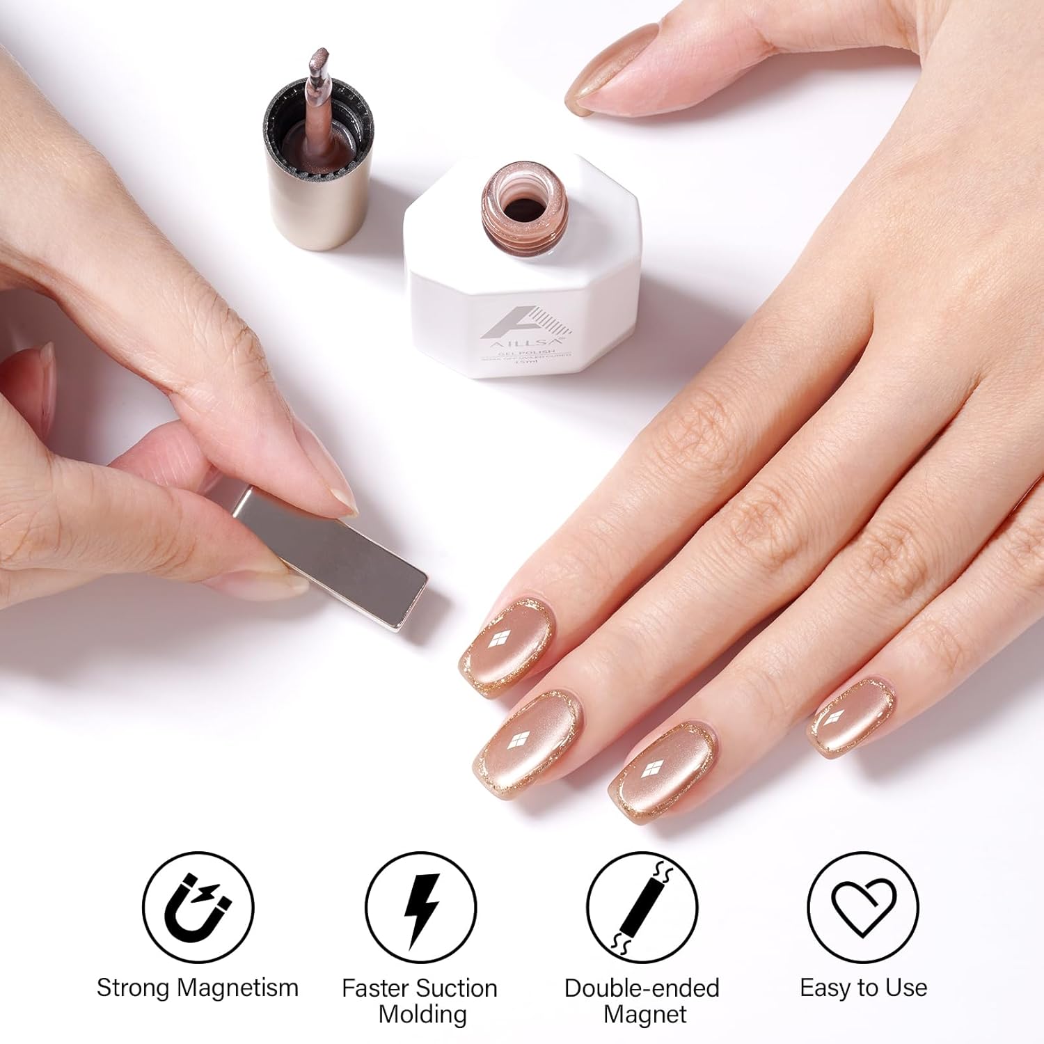 - CRYSTAL SPARKLING EFFECT - AILLSA Cat Eye Gel Nail Polish has a dense magnetic powder that can be used alone for a mirror-shimmering, crystal-clear manicure or with any base color nail polish, jelly gel nail polish, and other nail polishes.
