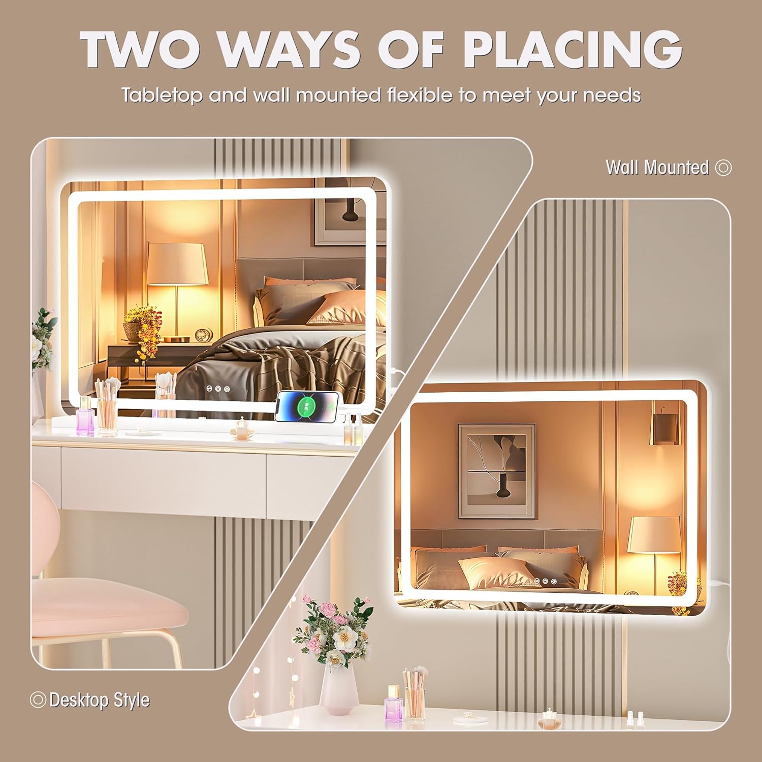 - 👍【Detachable Mirror Base & Hanging setting】Wall mounted or Table Top design meet your different needs.This large makeup mirror designed with detachable base and two back hole for nail. 1.Removing mirror base with a screwdriver. 2.Knocking two nails on the wall. 3.Hanging mirror on the wall.