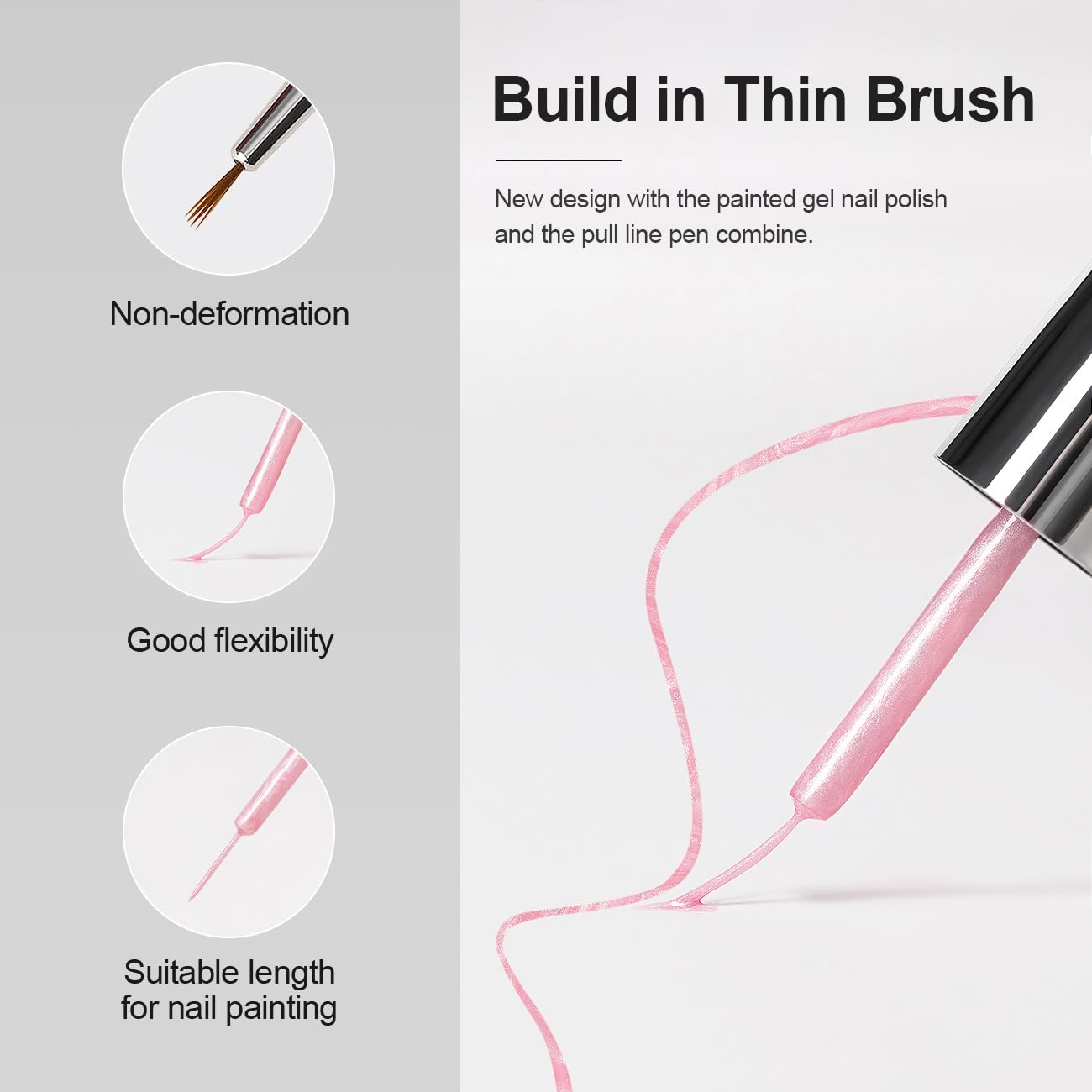 - BUILD IN THIN BRUSH:New design with the pearl white painted gel nail polish and the pull line pen combined is super convenient for the salon or at-home personal use for starters. Each bottle has a thin pen brush, no need to change and wash clean the drawing liner pen brush when doing the nail art