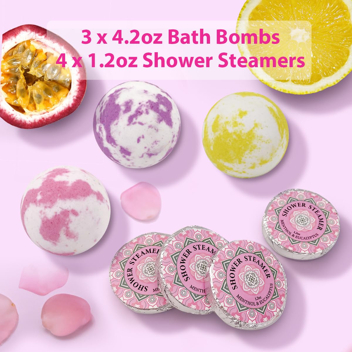 - Complete Spa Experience at Home: Indulge in a luxurious spa experience with our carefully curated beauty gift set, designed to pamper and rejuvenate. This comprehensive set includes 4 aromatic shower steamers, 3 fizzing bath bombs, 2 scented candles, and 1 exfoliating body scrub, 1 wooden scoop, 1 sleep mask, and 1 gifting card. creating the perfect ambiance for relaxation and self-care.