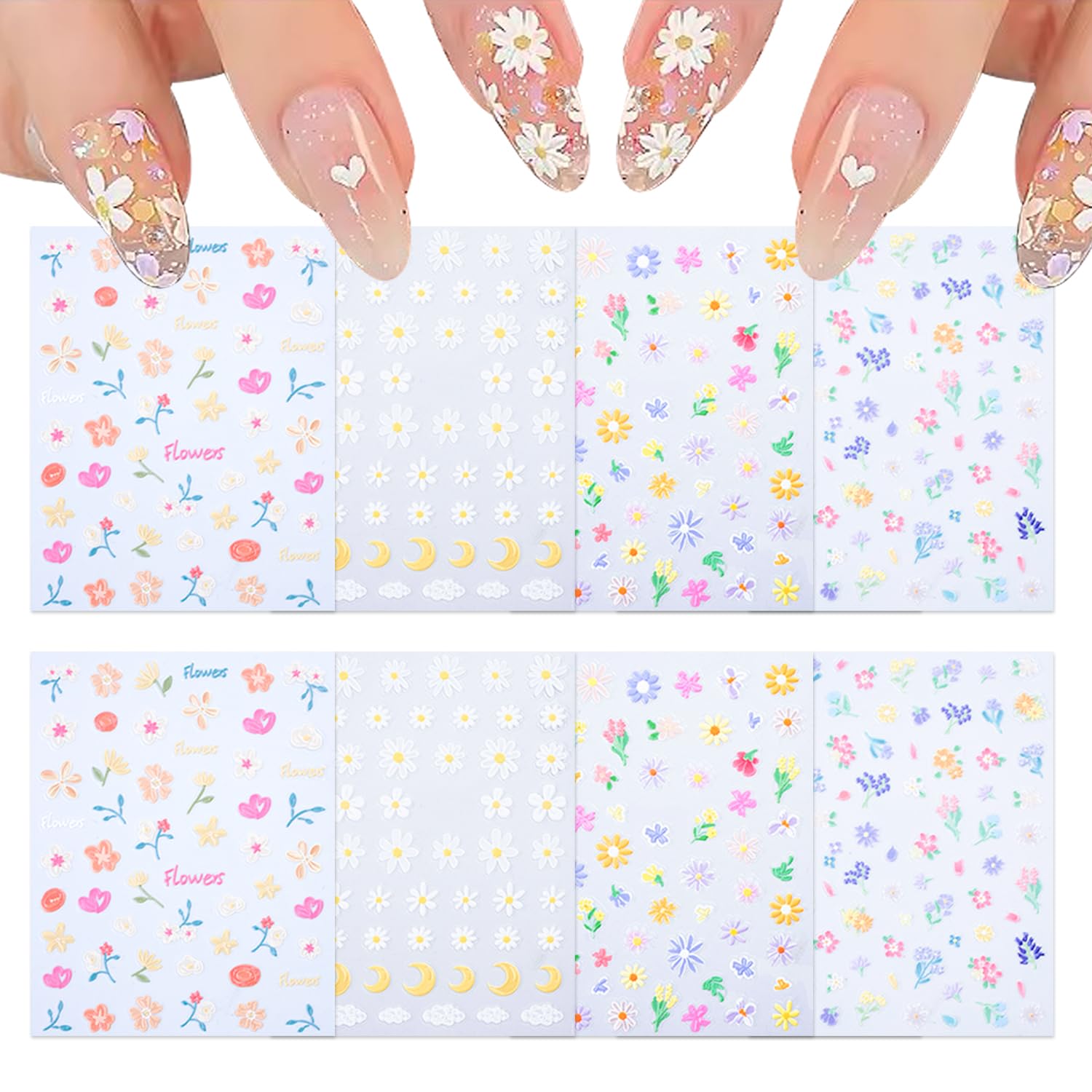 SILPECWEE 8 Sheets Flower Nail Art Stickers 3D Flower Daisy Nail Stickers Self-Adhesive Nail Design Stickers Spring Nail Decals for Nail Art Decoration Accessories