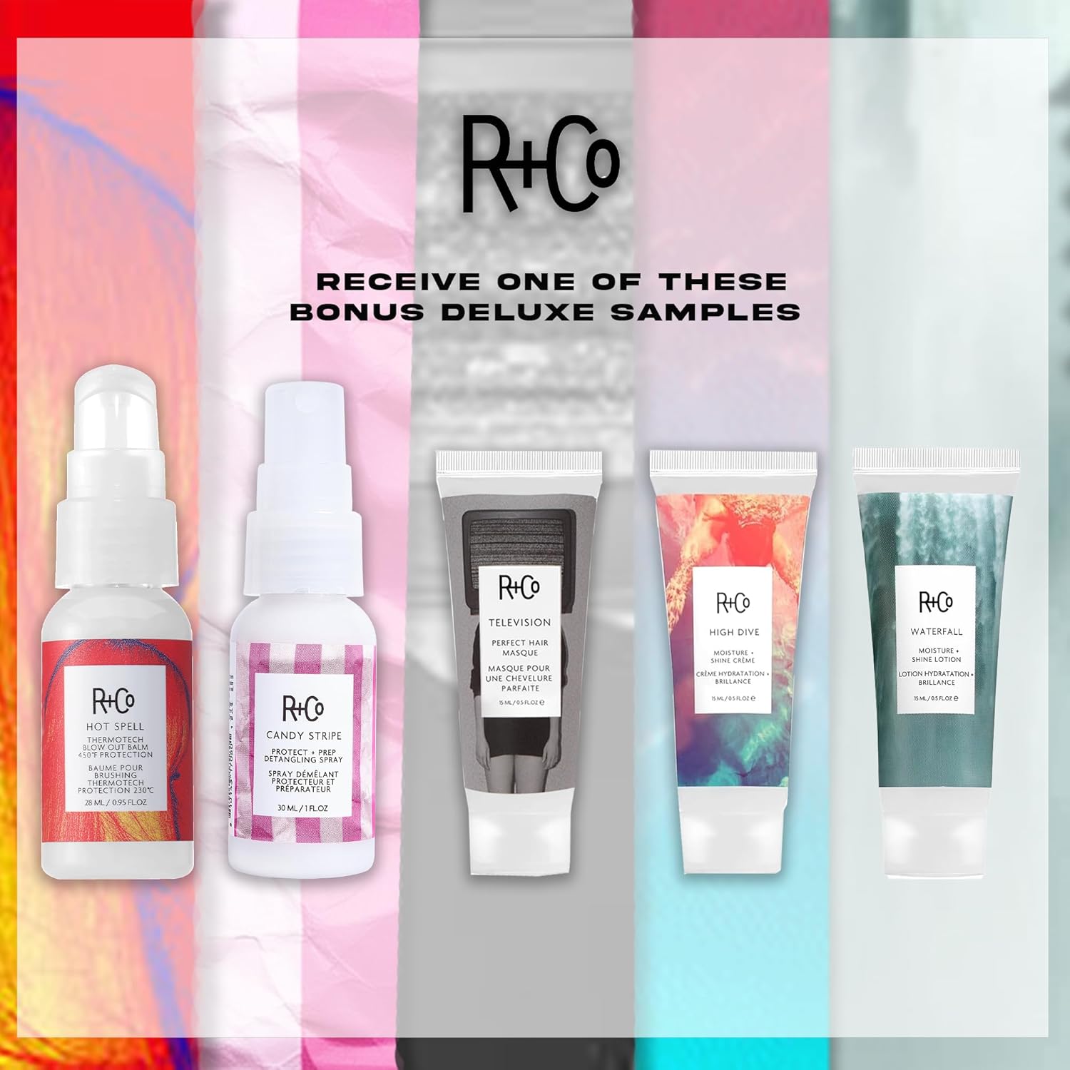 - Includes: R+Co Atlantis Moisturizing B5 Shampoo and Conditioner (1L) + High Dive Creme Sample