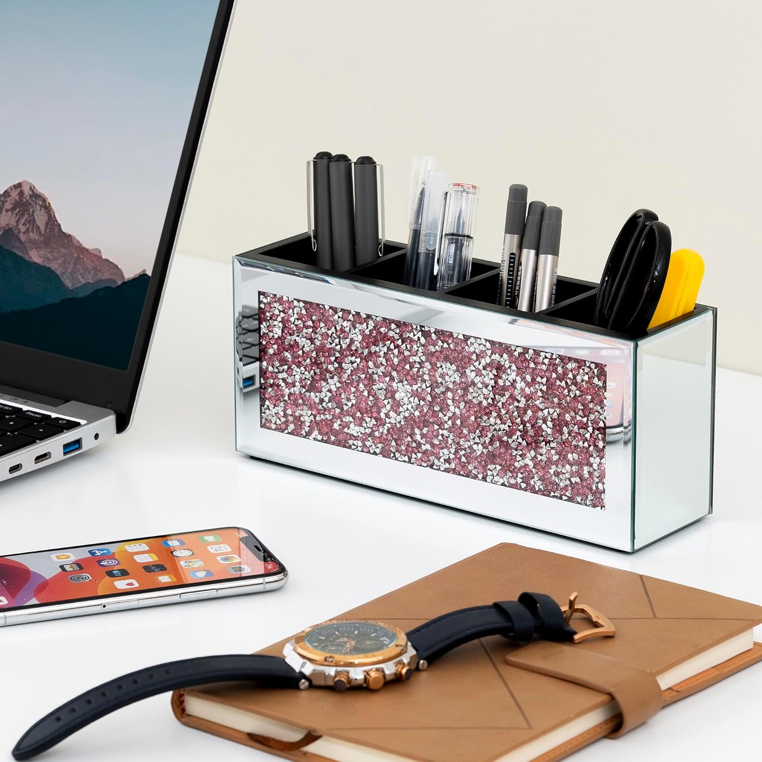 - Chic Pink Design with Crystal Accents: Add a pop of color to your vanity with the SHYFOY Makeup Brush Holder in pink. The mirror glass finish with sparkling pink crystal diamonds on the front creates a sophisticated yet playful look, while the 4-slot design offers ample space for your brushes and tools.