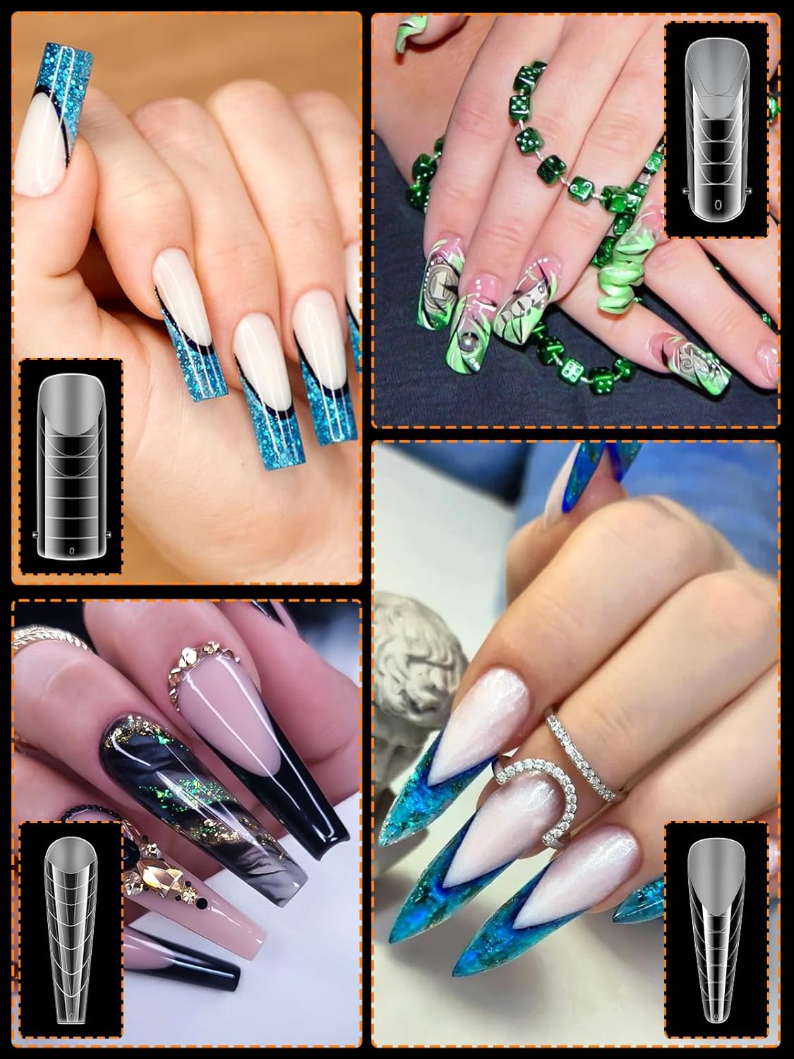 - 【8 Shapes with 12 Sizes】Both dual nail extension molds tips and French dual sticker silicone pads come in 8 style shapes and 12 sizes, each is engraved with numbers "0-11" for easy to recognize,which is convenient for you to design the nail length you want. And each size of long nail tips is separated by a small grid, a total of 12 grids, so they're easy and convenient to choose the suitable size to meet your nail's need