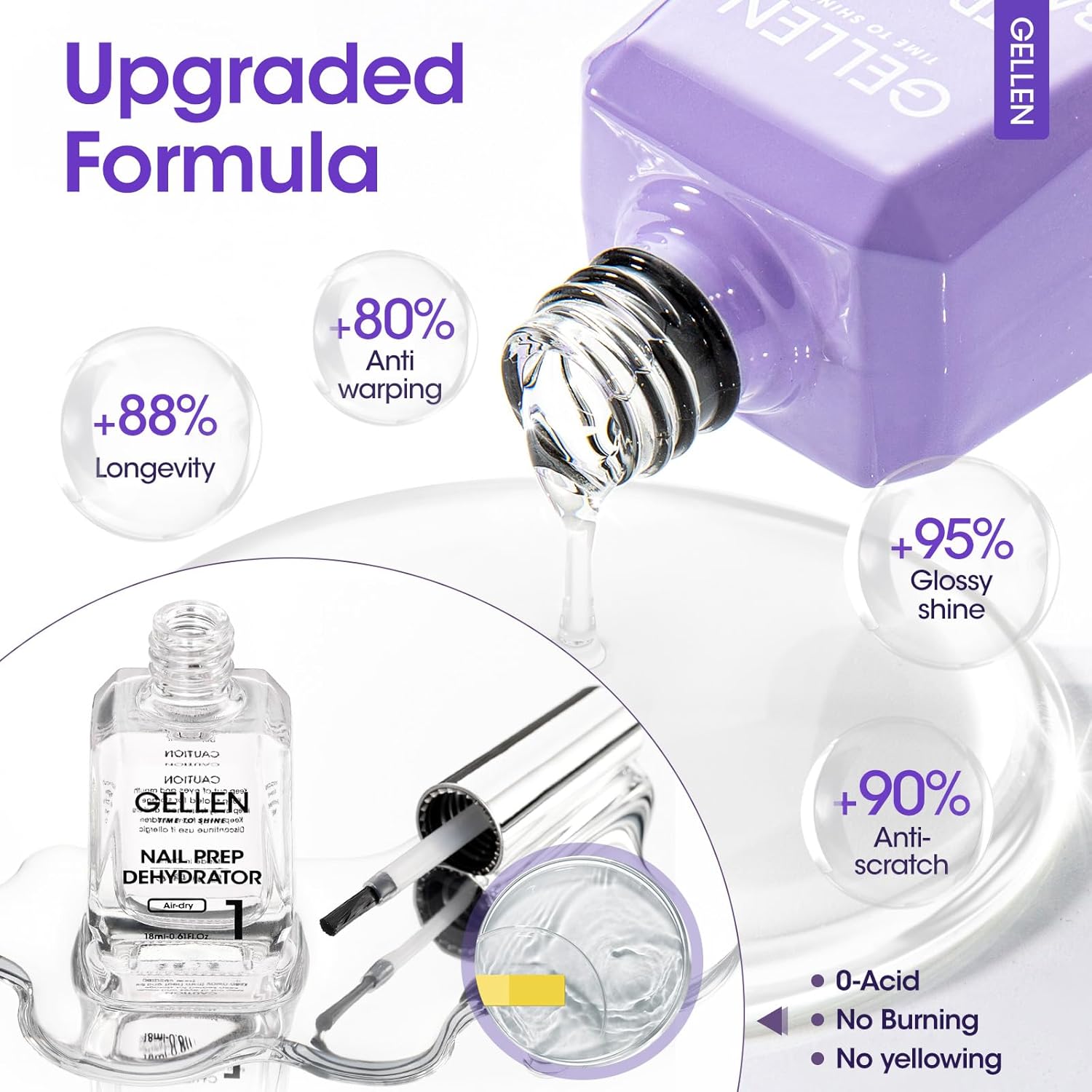 Gellen Nail Dehydrator and Primer with Base Coat Top Coat, Acid-Free Hema-free Nail Prep Dehydrator Primer 18ml UV Superior Glossy Top Coat for Acrylic Gel Nail Polish Nail Art Supplies Gift for Women