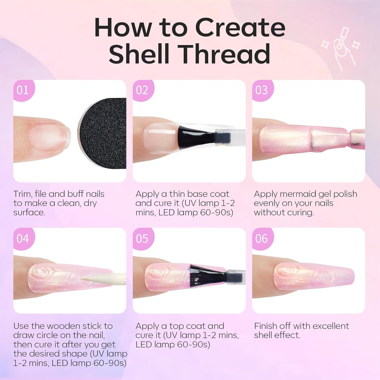 - NOTE: It is normal for the gel to be a little sticky, in order to better draw the thread effect. Use the Dotting Pen to create a Swirl Shell Thread effect for a truly magical look!