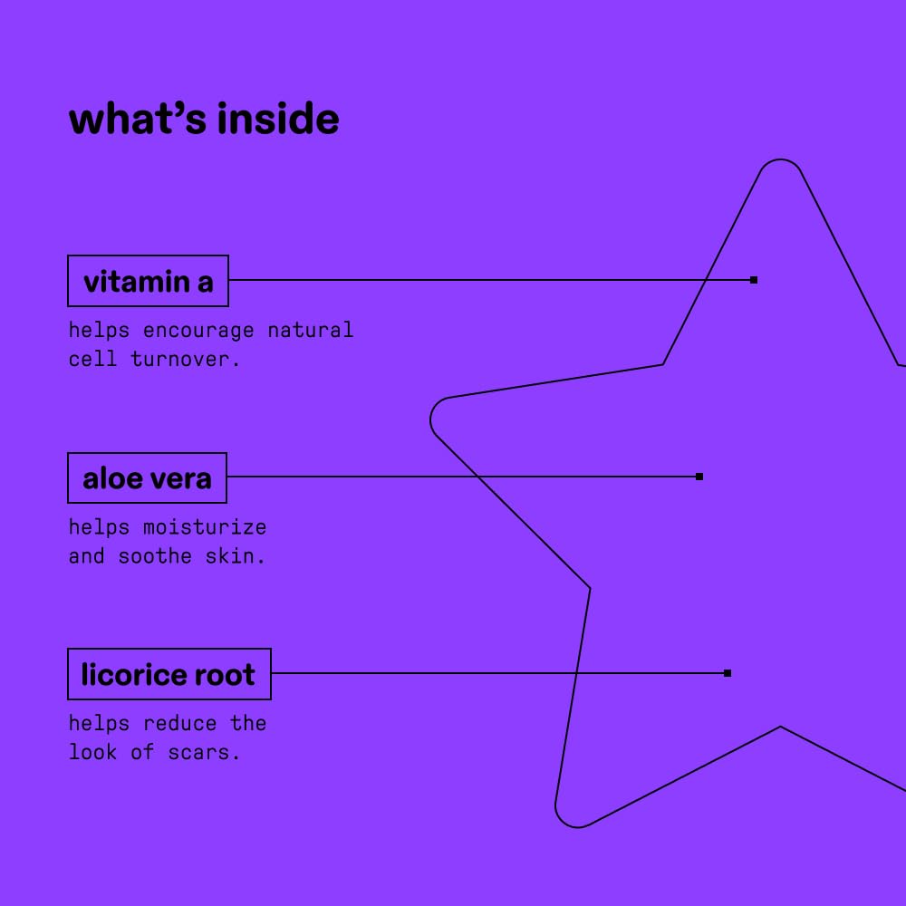 - STAR INGREDIENTS: Vitamin a, which encourages natural cell turnover, is combined with calming aloe vera, licorice root, a plant-based extract that helps reduce the look of scars, and hydrocolloid to support skin recovery after picking.