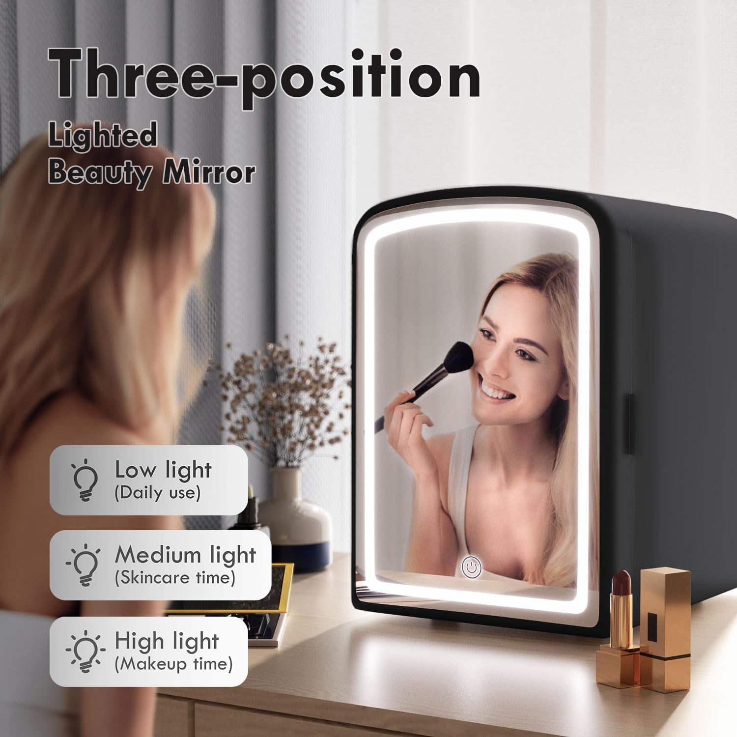 Mini Fridge for Skin Care, 4 Liter Portable Small Fridge with Dimmable LED Mirror, Hot or Cold Personal Beauty Refrigerator for Bedroom, Office, Car, Makeup(BLACK)