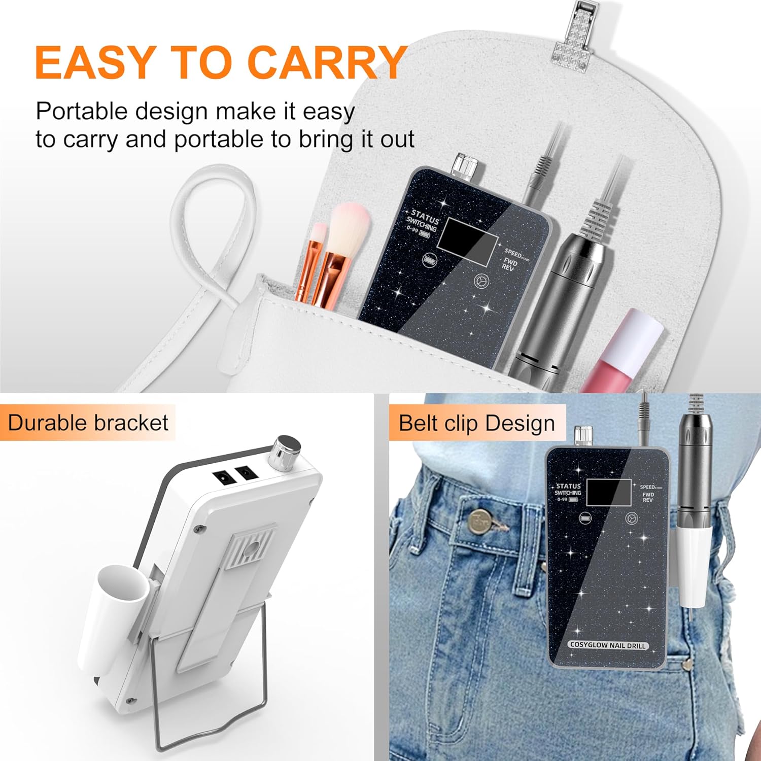Professional Electric Nail Drill File:COSYGLOW Glitter Portable Cordless E-File Nail Drill Kit with 11 Drill Bits,30000 RPM Rechargeable Nail Drills Machine for Acrylic Nails Gel Polishing(Black)