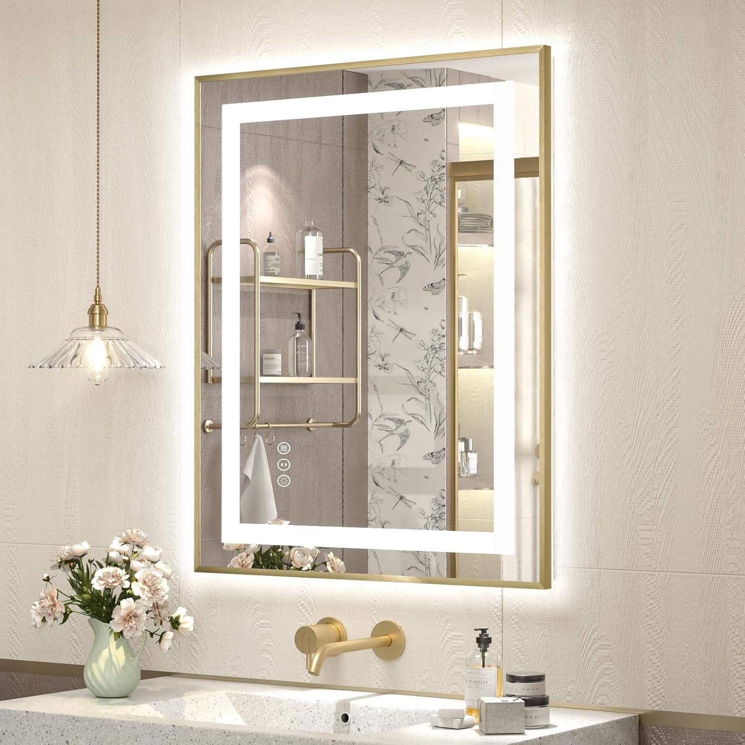 OKPAL 24x32 Gold LED Bathroom Mirror with Lights, Frontlit & Backlit Metal Framed Mirror, Lighted Bathroom Vanity Mirror, Anti-Fog, Dimmable 3 Colors, Shatterproof, Horizontal/Vertical