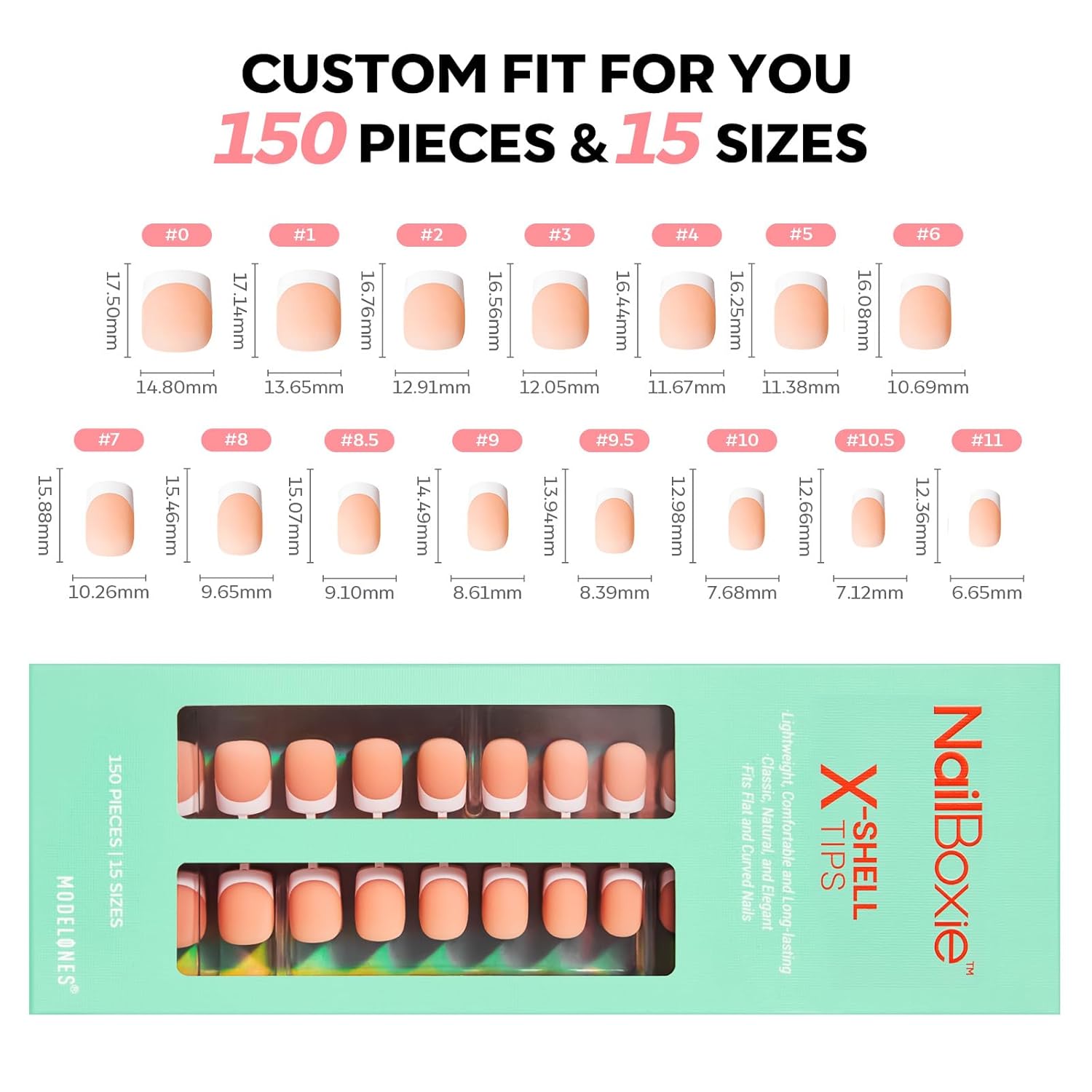 - French Tip Press on Nails Set: Upgraded classic French manicure style kit includes 150 pieces in 15 sizes for a perfect fit on your nail beds. Works beautifully on all nail types, including short and flat nails.
