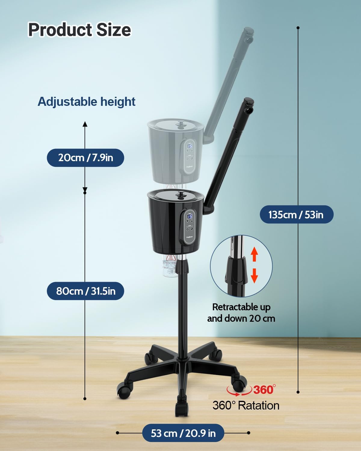 - 【Detachable, Height-Adjustable Design】With a detachable, easy-to-clean water cup and a height-adjustable stand, this steamer is built for convenience. Adjust the height and enjoy a 360° rotating nozzle, perfect for a personalized, comfortable treatment while sitting or lying down. The wheeled stand offers effortless mobility, suiting both home and salon use