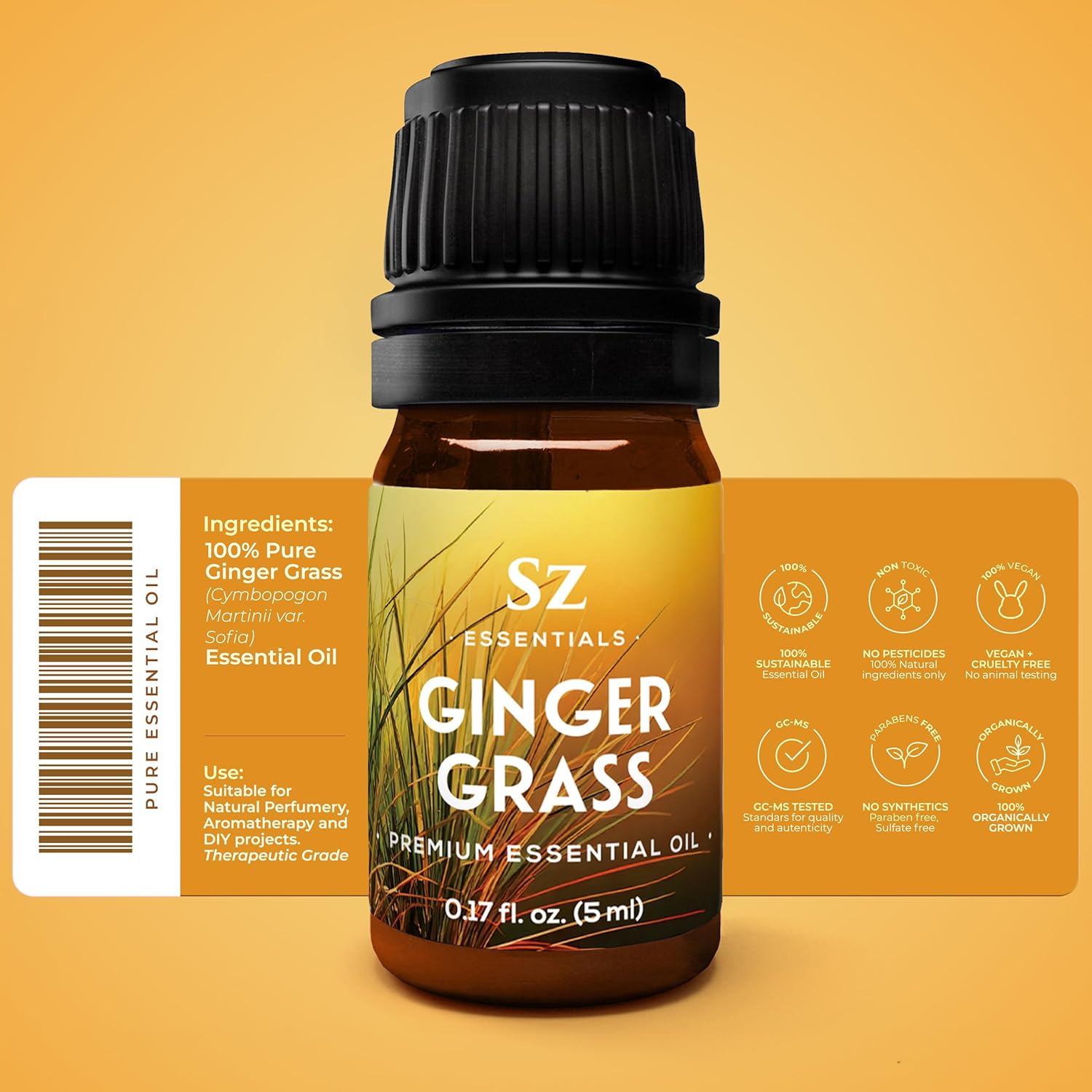 - Ingredients: 100% Pure Ginger Grass (Cymbopogon martinii var. sofia) Essential Oil