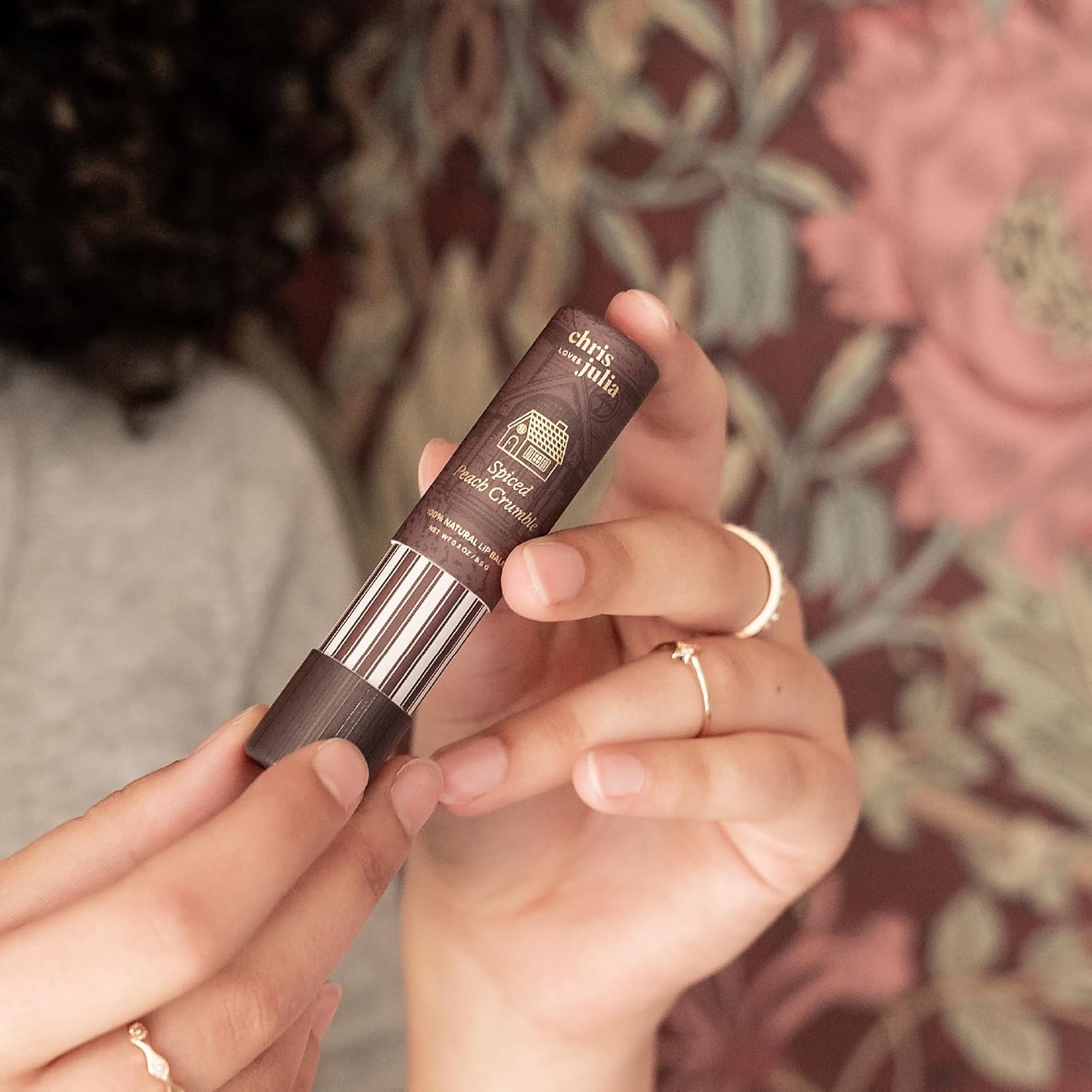 - CHRIS LOVES JULIA (limited edition) gift set featuring 3 lip balms: Blackberry Campfire S'mores, Spiced Peach Crumble, and Baked Pears & Rosemary Caramel.
