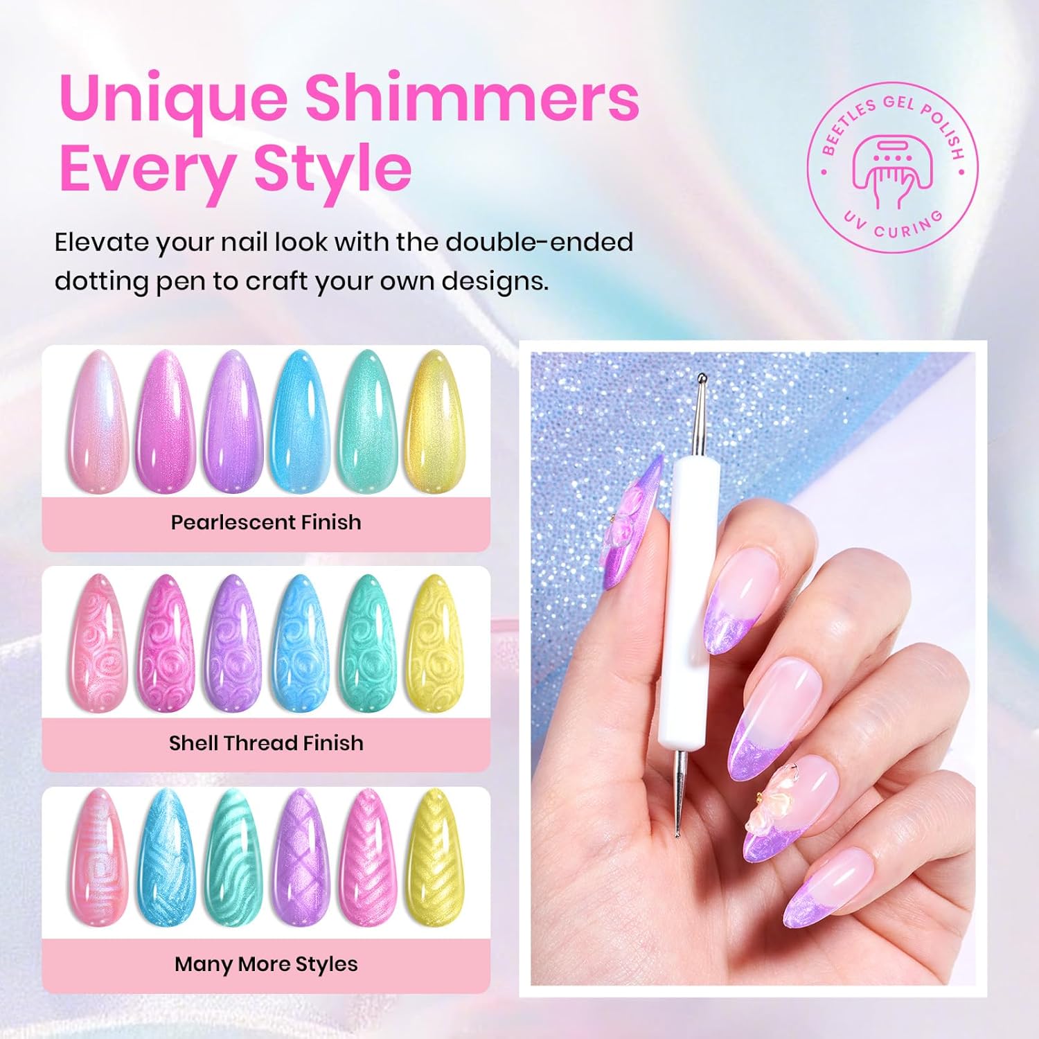 Beetles Shimmer Gel Nail Polish Set, 6 Colors Pink Blue Yellow Green Purple Iridescent Pearl Nail Polish Soak Off Uv Mermaid Gel Nail Polish Swirl Shell Thread Effect DIY Gift for Women
