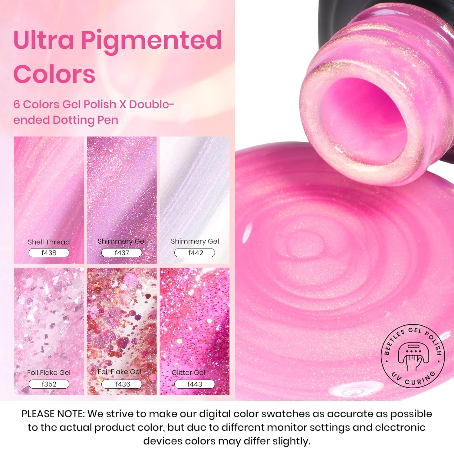 Beetles Pink Gel Nail Polish Set - 6 Colors Shimmer Nail Polish Nail Kit Hot Pink Pearl White Glitter Color Gel Pink Reverie Collection Soak Off Uv LED Nail Lamp Gift for Women & Girls