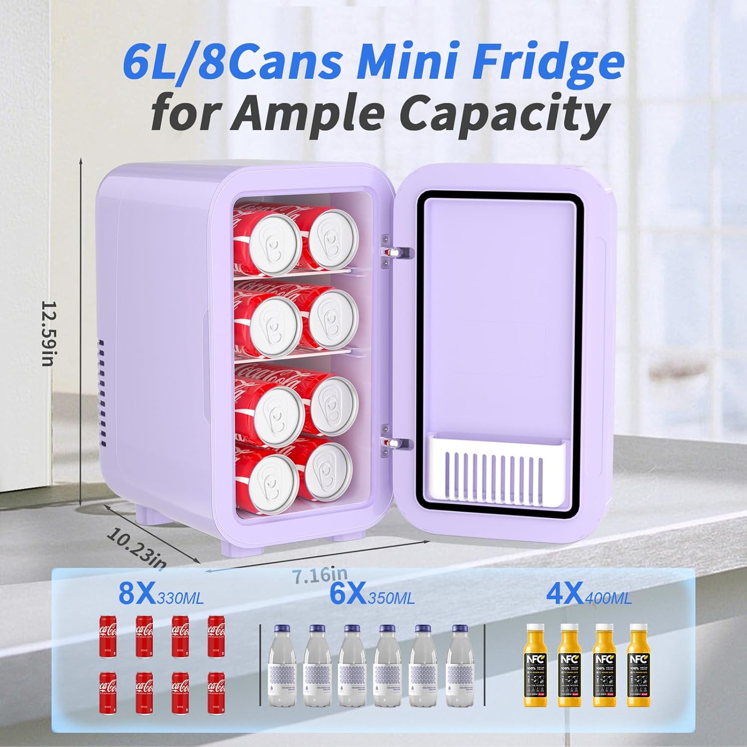 - 6 Liter Capacity: This mini refrigerator can hold up to 8 (16oz) cans and measures 7.16” x 10.23” x 12.59”. Equipped with a removable shelf, it allows you to neatly organize drinks, breast milk, skincare products, cosmetics, pet food and kids snacks. A thoughtful gift idea to show love and care for friends and family