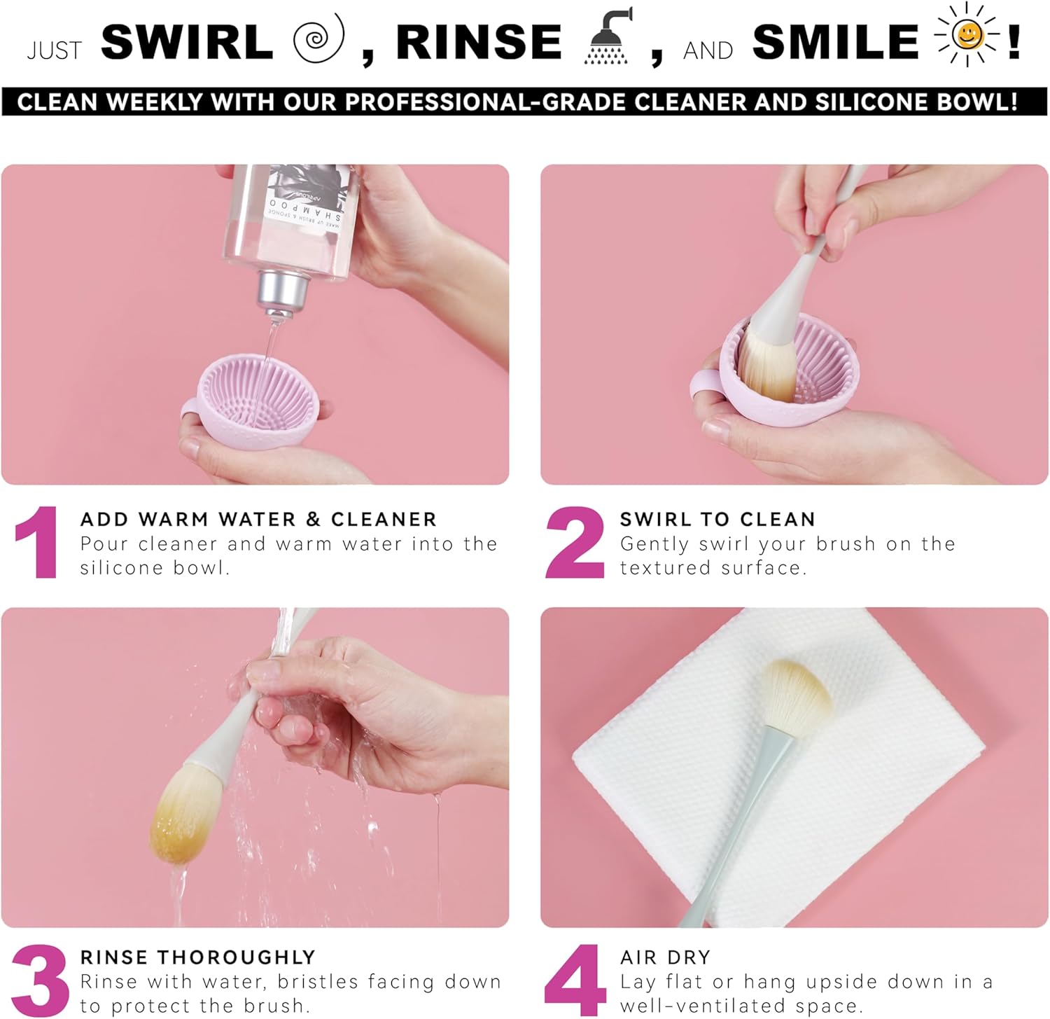 - [Clean in a Snap] Just add lukewarm water and a small amount of cleaner, swirl your brushes in the bowl, rinse with clean water, reshape, and lay flat to dry. Crafted for daily use, this quick and easy process keeps your brushes in top condition. Never run out by using Subscribe & Save, so your brushes are always fresh and ready for your next beauty routine!