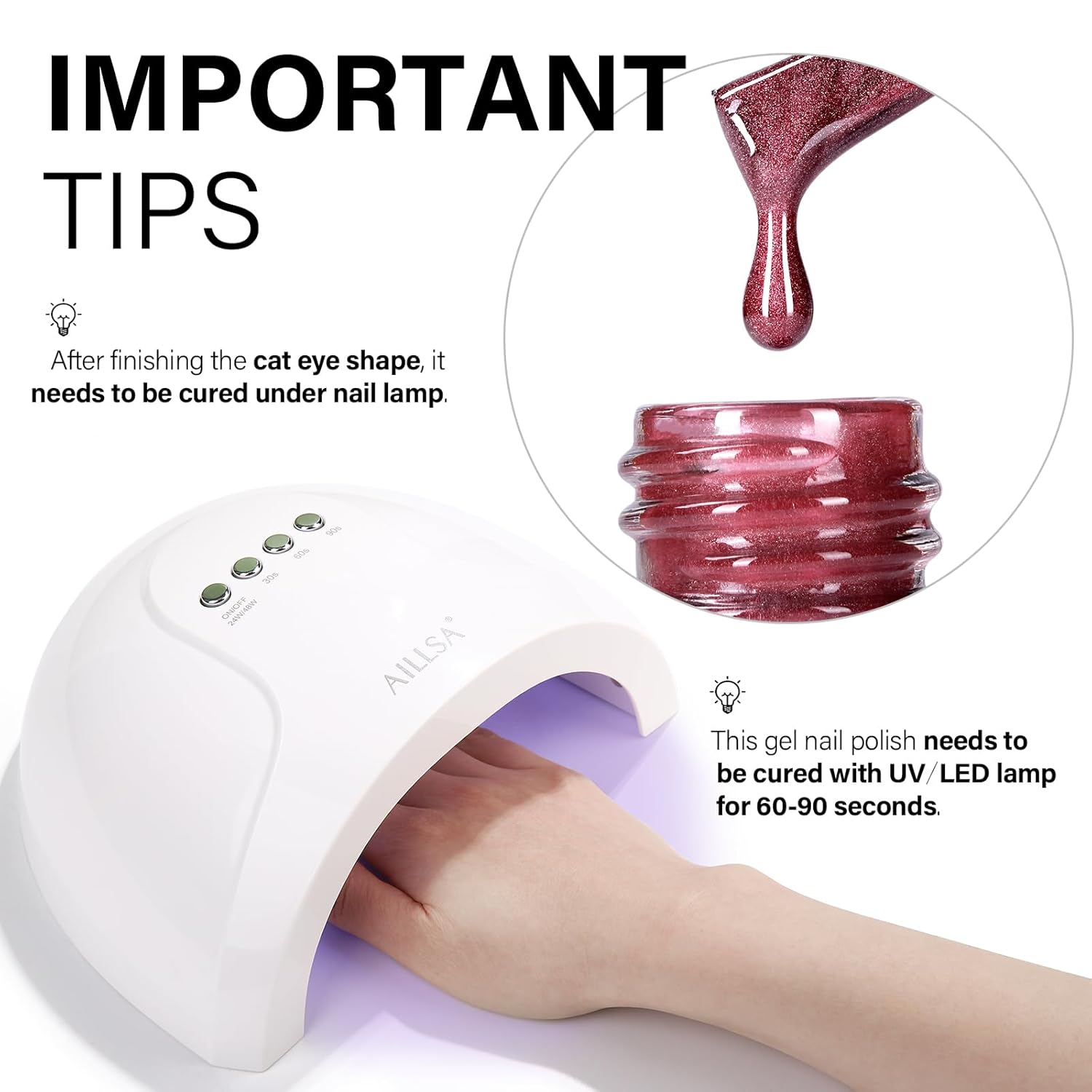 - Whatβs Included: Including a 0.51 fl oz (15 ml) red gel polish and a magnetic block. Use the magnet to shape the magnetic powder and create custom cat-eye designs. Enjoy a salon-quality manicure experience right at home.