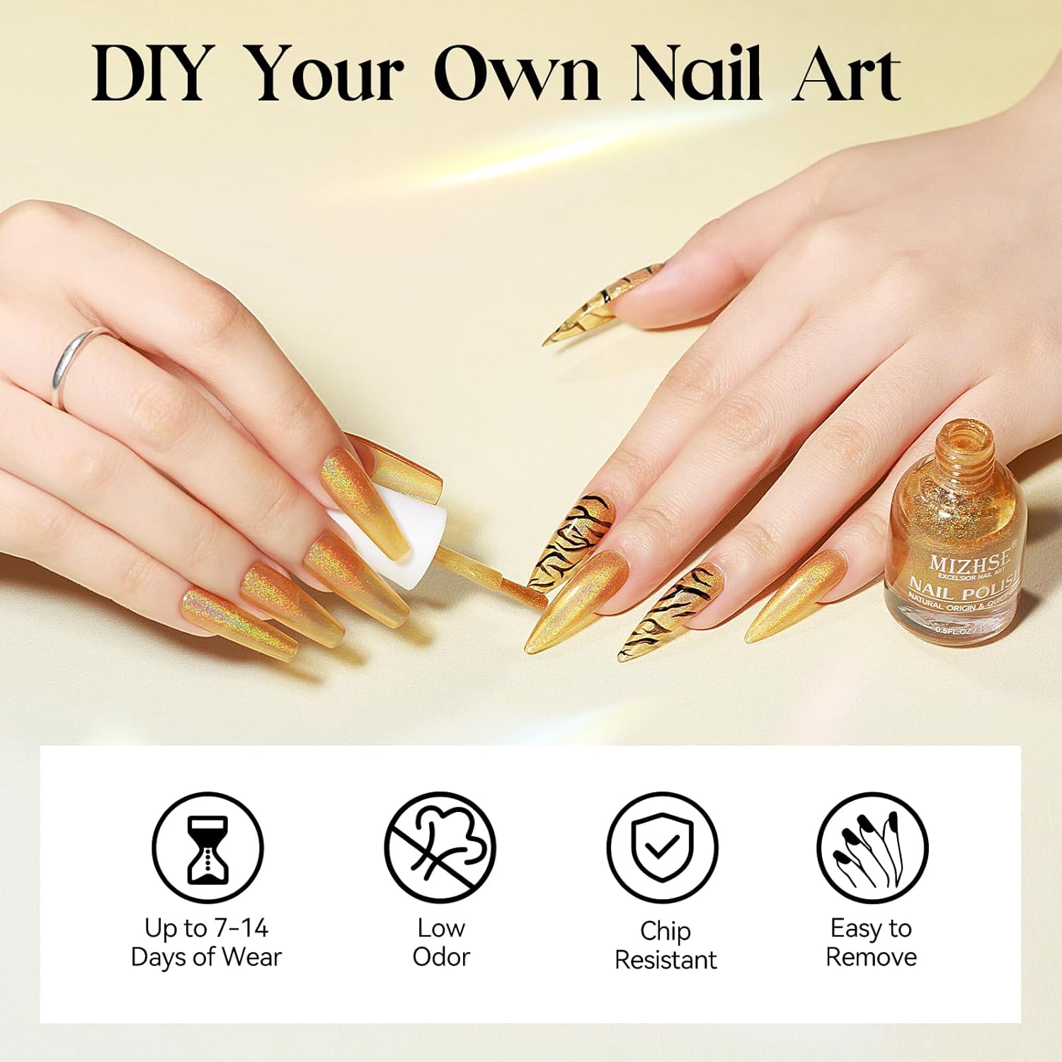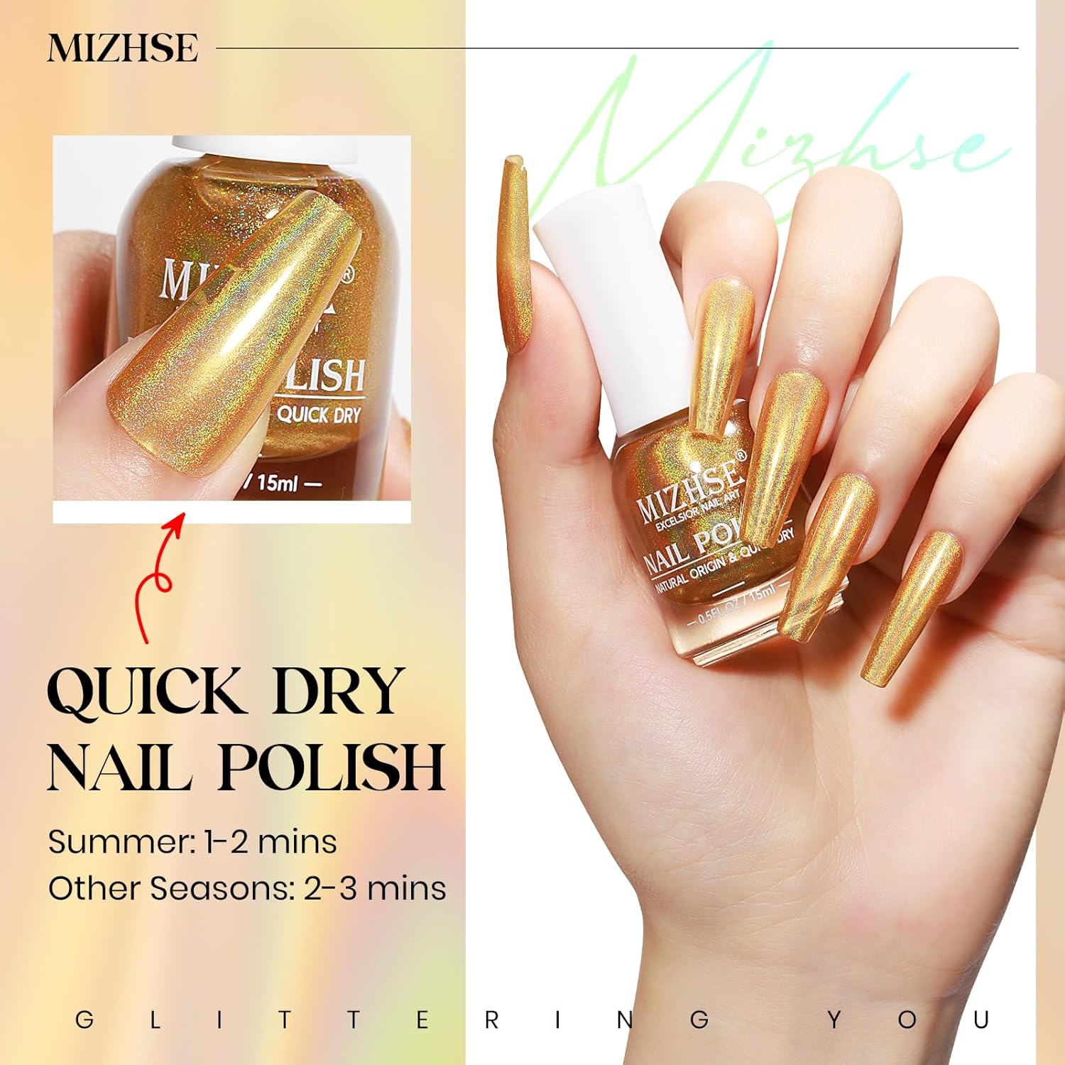 MIZHSE Holographic Nail Polish, Gold Glitter Nail Polish Air Dry Fast, 15 ml 0.5 fl oz High Glossy Shiny Nail Pigment Oil-based Laser Iridescent Chrome Halo Nail Art Salon Manicure Home