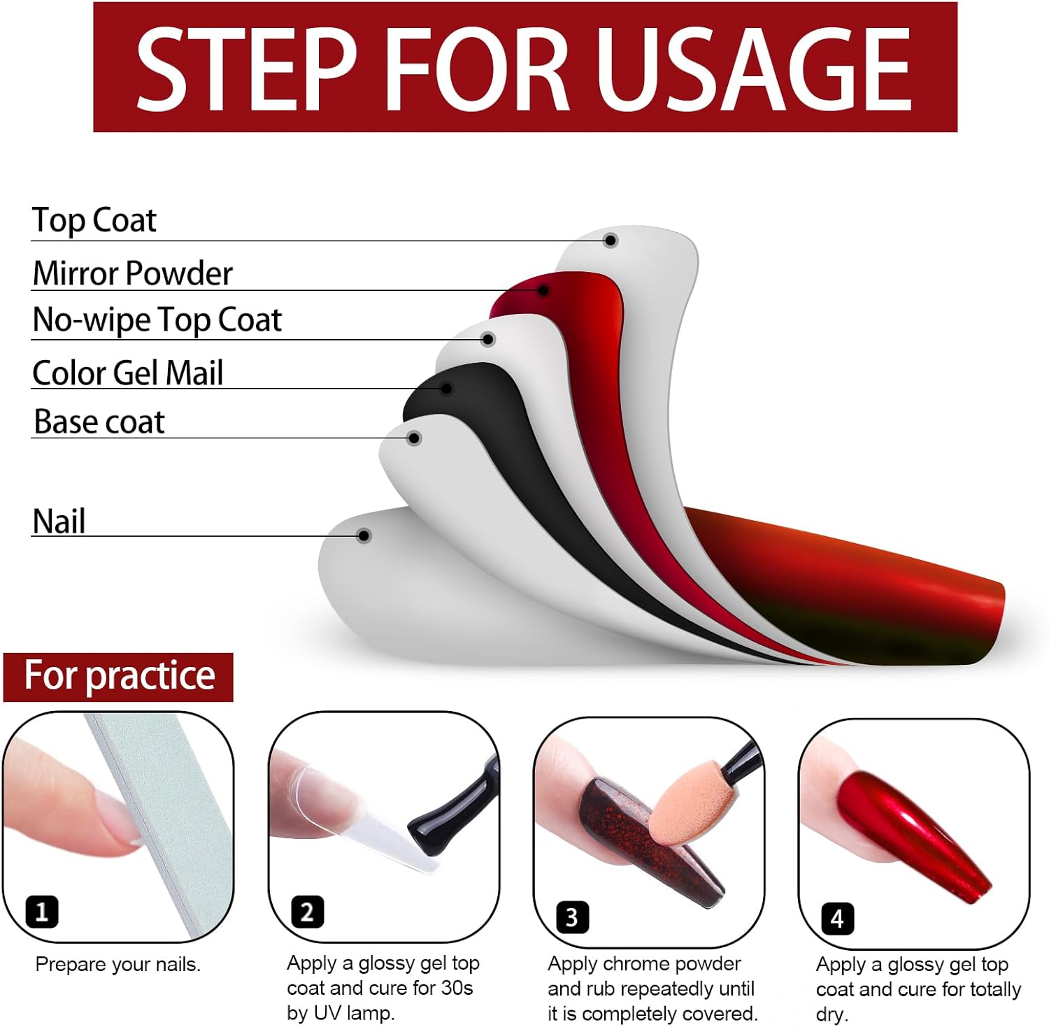 - 【The Scope Of Application】:All chrome powders should only be applied to glossy No wipe top coat to embellish Nail-Polishes color. Otherwise it is unusable, it can't be applied directly to the nail, and it can't be applied directly to the skin. Artdone chrome powder can be applied on UV gel nails, acrylic nails or false nail tips. You can use them very easily