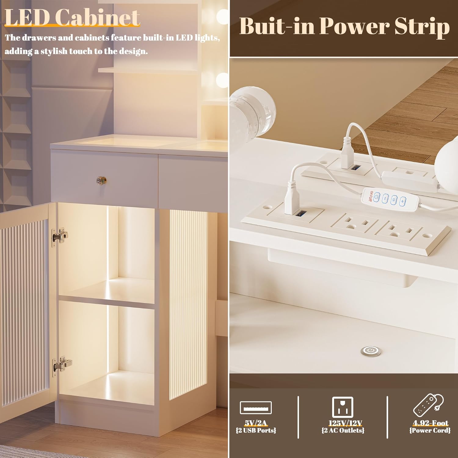 - ăBuilt-in Charging Station and Hair Dryer Standăvanity with lights includes 2 standard electrical outlets, 2 USB ports, and a dedicated hair dryer stand, allowing you to conveniently connect and charge your hair tools, smartphones, tablets, and other devices.Stay organized and worry-free with our multifunctional girls vanity.