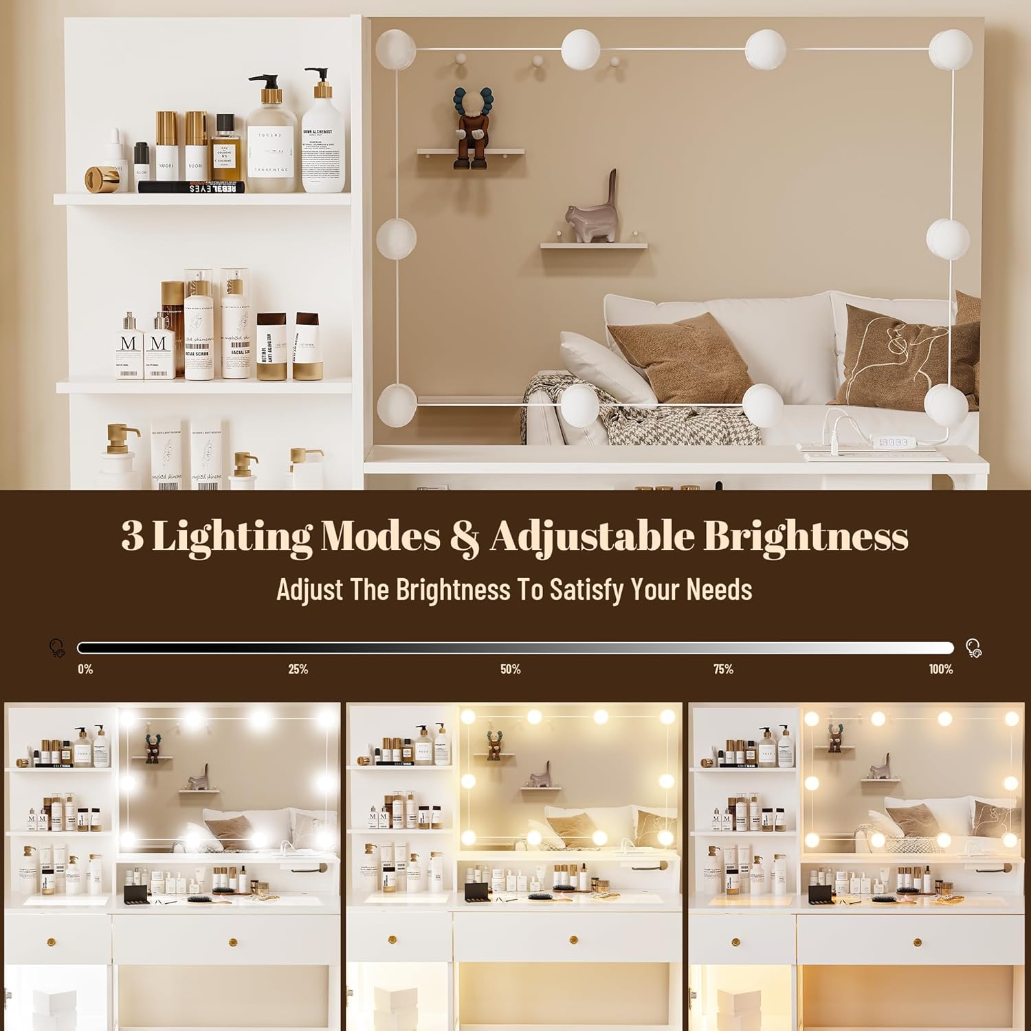 - ăVanity Set with Large Mirror and LED LightsăThis makeup vanity desk with lights features a large mirror with 10 Hollywood-style LED bulbs. Choose from 3 color modes (warm yellow, warm white, and cool white) and adjust the brightness settings to create the perfect lighting for your makeup needs. Ideal for home, work, hair salons, and studio makeup applications.