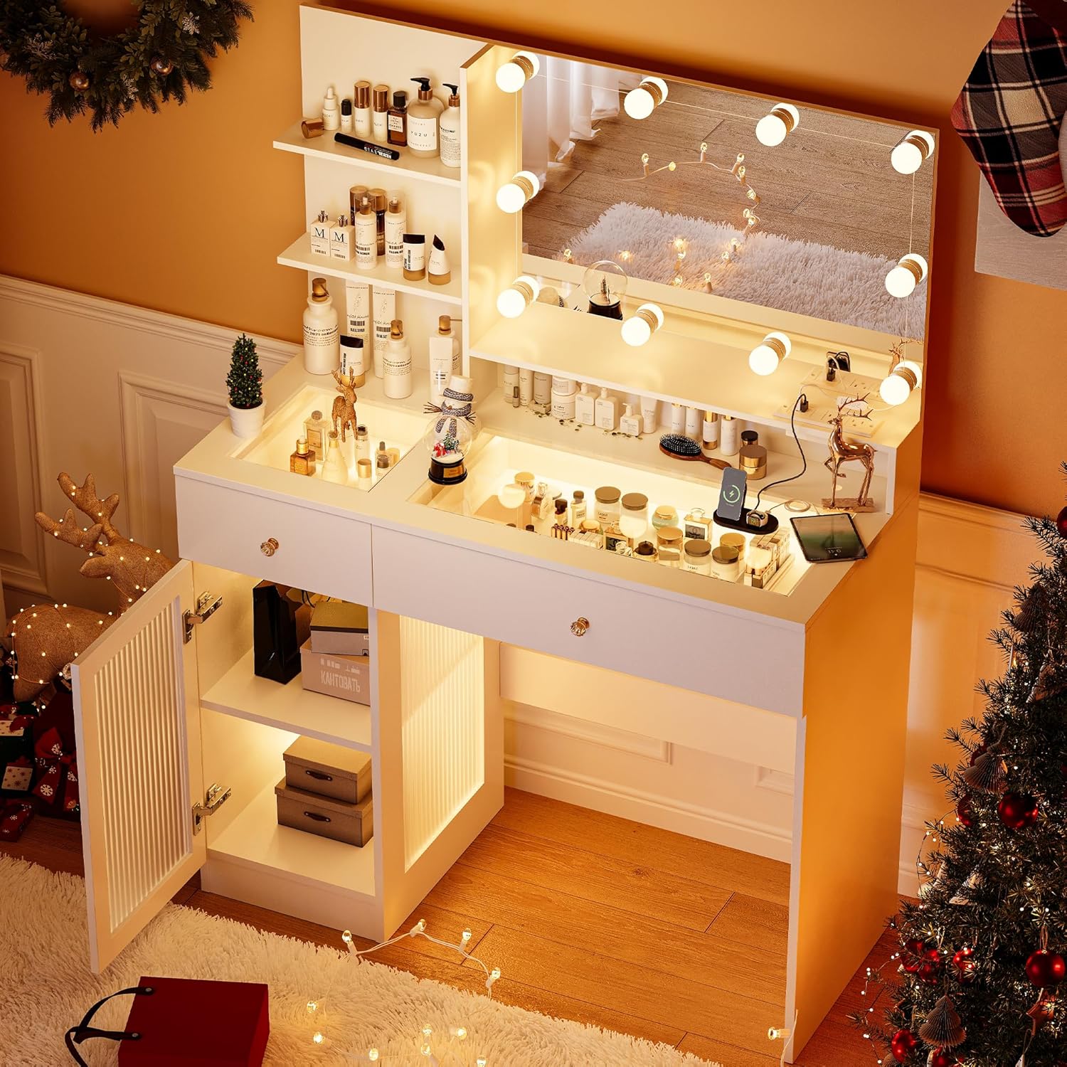 - ăAmple Storage Spaceăwhite vanity with lighted mirror offers a compact design without compromising on storage capacity. With 2 drawer, 3 shelves, and a acrylic 2-tier storage cabinet, you can easily store and access all your makeup essentials, jewelry, perfumes, hair straighteners, and more.