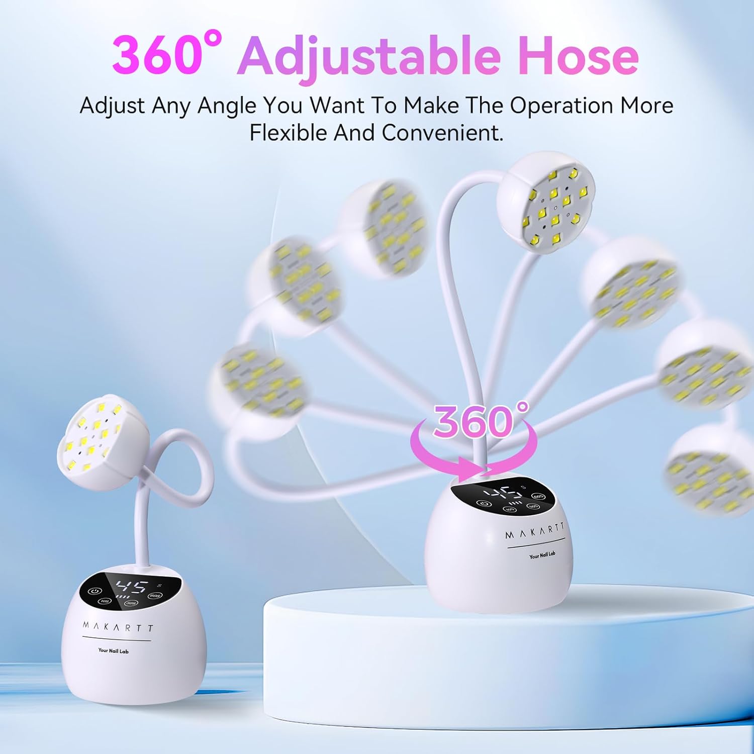 - 360° Degree Adjustable Direction: Makartt UV nail lamp features a flexible gooseneck, allowing you to bend and maneuver it to any angle for optimal curing. It ensures full coverage of gel nails, including hard-to-reach areas like your pinkies and thumbs, for flawless results every time.