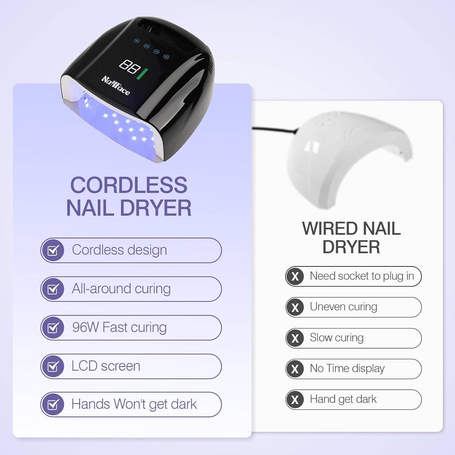 - Portable Cordless Nail Dryer: Wireless UV light for gel nails eliminates tangled cords; Slim design accommodates long nails and includes a detachable mirror base for pedicures; Compact build ideal for travel or salon use